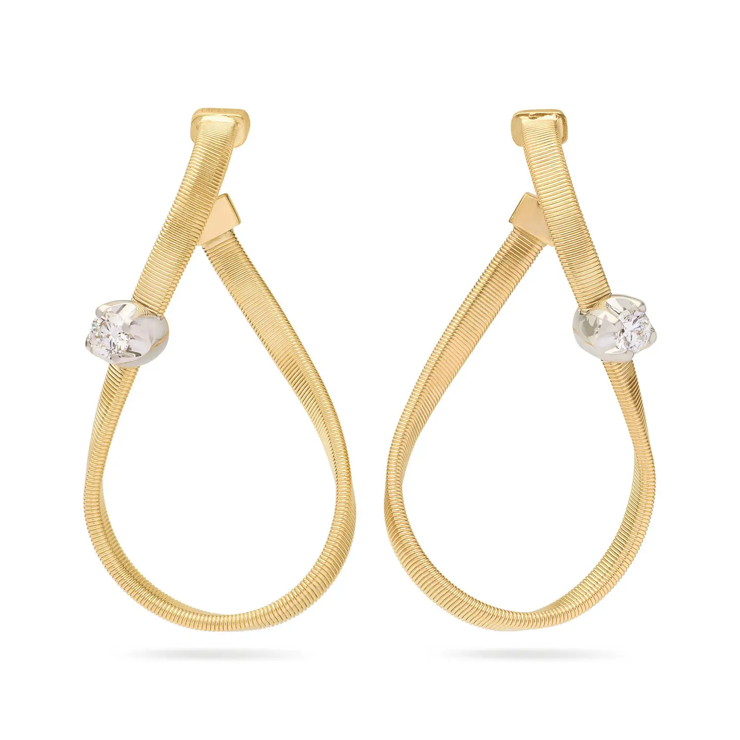 Đôi hoa tai vàng Marco Bicego Marrakech OG404_B8 YW M5 được chế tác từ vàng vàng và vàng trắng 18K (750/1000) và thuộc bộ sưu tập Marrakech, lấy cảm hứng từ những đường nét uốn lượn của các con phố cổ tại thành phố Marrakech của Maroc. Điểm đặc trưng của thiết kế là kỹ thuật coil, trong đó sợi vàng mảnh được quấn xoắn thủ công quanh lõi vàng tạo nên bề mặt độc đáo.