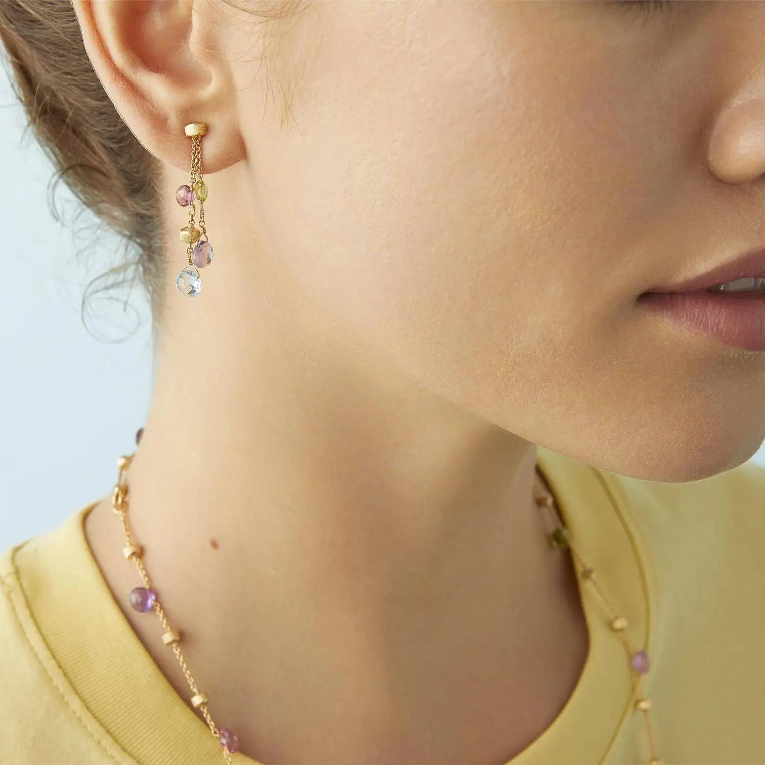 Hoa tai có thiết kế thả nhiều hàng, trong đó các viên đá quý tự nhiên được cắt facet được xâu trên những sợi vàng mảnh. Giữa các viên đá là những hạt vàng chạm khắc thủ công, được hoàn thiện bằng kỹ thuật Florentine bulino, tạo bề mặt satin tinh tế.