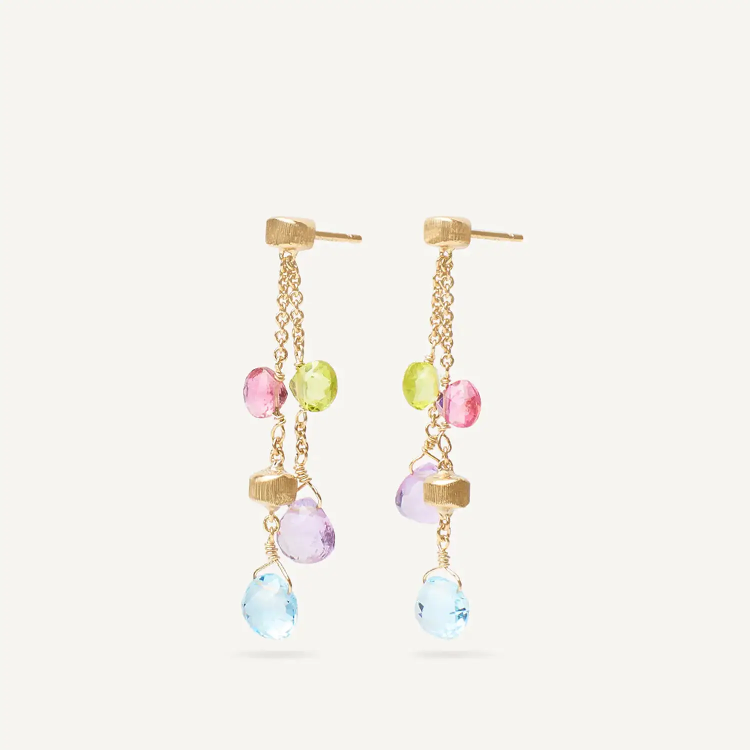 Đôi hoa tai vàng Marco Bicego Paradise OB914 MIX01 Y 02 được chế tác từ vàng vàng 18K (750/1000) và thuộc bộ sưu tập Paradise, lấy cảm hứng từ màu sắc rực rỡ của các loại đá quý tự nhiên và ánh sáng của vùng Địa Trung Hải. Thiết kế kết hợp các sợi vàng mảnh với đá quý nhiều màu, tạo nên vẻ đẹp vừa thanh lịch vừa sống động.