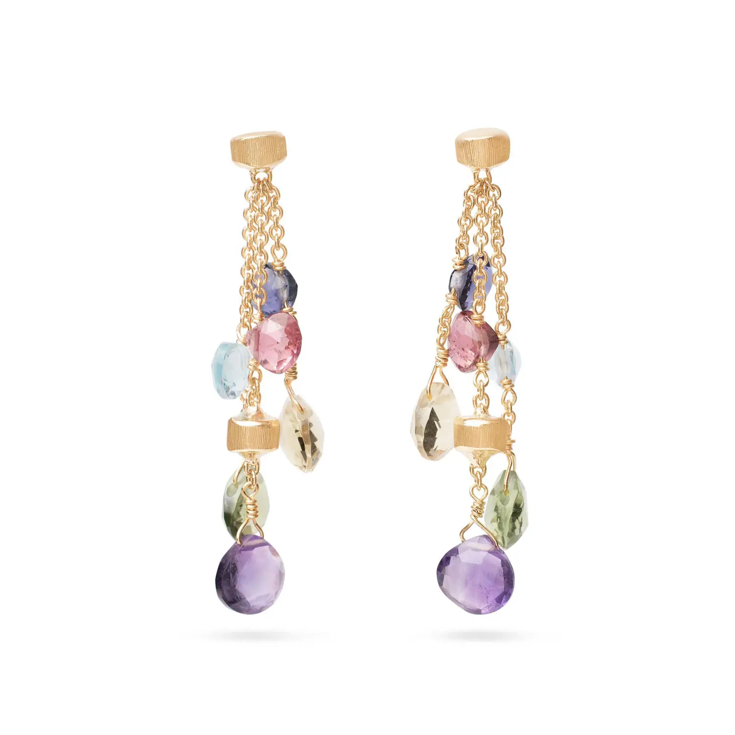 Hoa tai có thiết kế thả ba hàng, trong đó các viên đá quý tự nhiên được cắt facet được xâu trên những sợi vàng mảnh. Giữa các viên đá là những hạt vàng chạm khắc thủ công, được hoàn thiện bằng kỹ thuật Florentine bulino, tạo bề mặt satin đặc trưng.