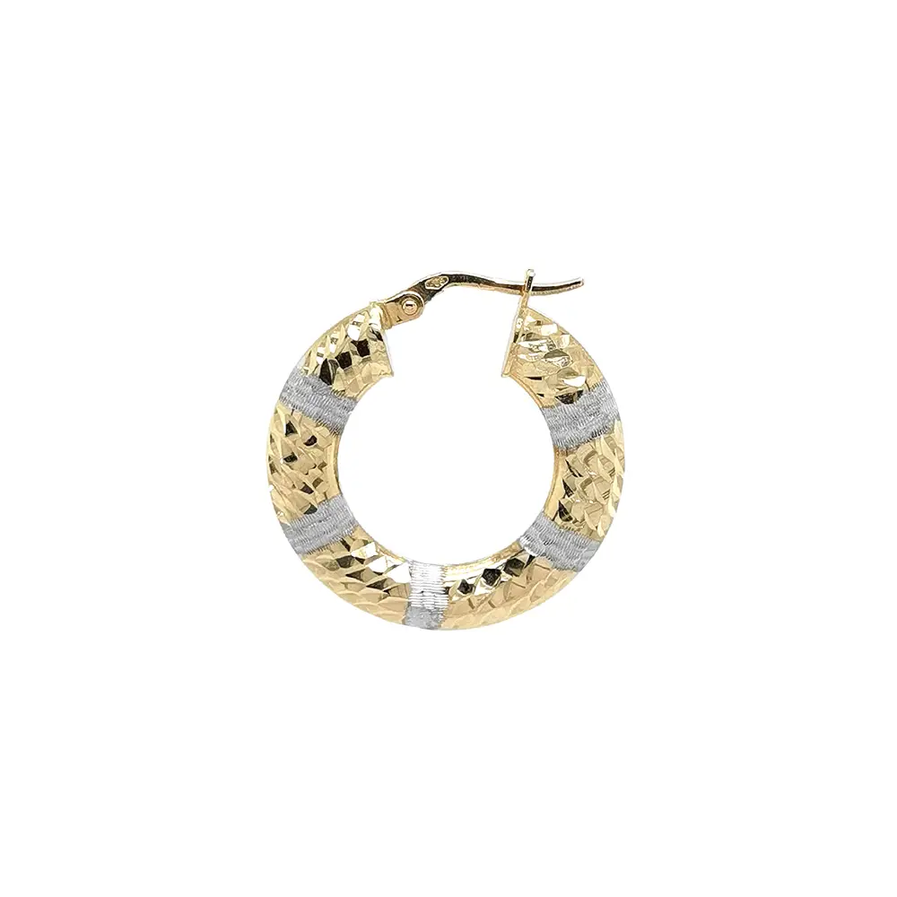 Hoa tai vòng vàng cao cấp hai tông màu nổi bật với thiết kế tinh giản, vượt thời gian nhờ sự kết hợp hài hòa giữa vàng vàng và vàng trắng. Sự tương phản tinh tế của hai sắc vàng mang đến vẻ đẹp sang trọng, dễ dàng phối hợp cùng các trang sức khác.