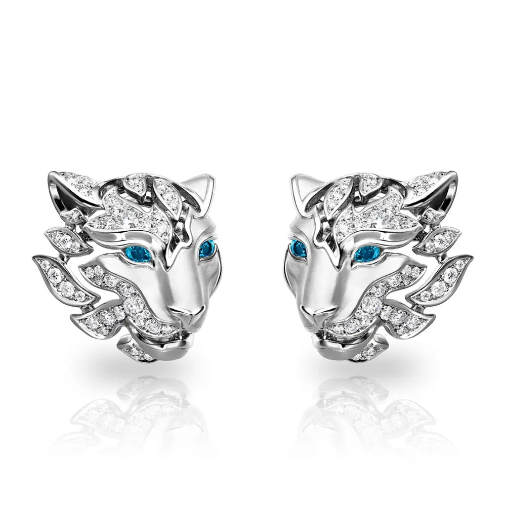 Đôi bông tai được trang trí bằng 88 viên kim cương lấp lánh với tổng trọng lượng 0.81 carat, mang lại sự rực rỡ và tinh tế cho thiết kế. Hai viên kim cương xanh nổi bật với trọng lượng 0.23 carat làm đôi mắt của hai con thú, tạo nên ánh nhìn mạnh mẽ và đầy cá tính. Đôi bông tai toát lên sự tự tin nhưng vẫn giữ được sự tinh tế và phù hợp cho cả những dịp thường ngày lẫn trang trọng.