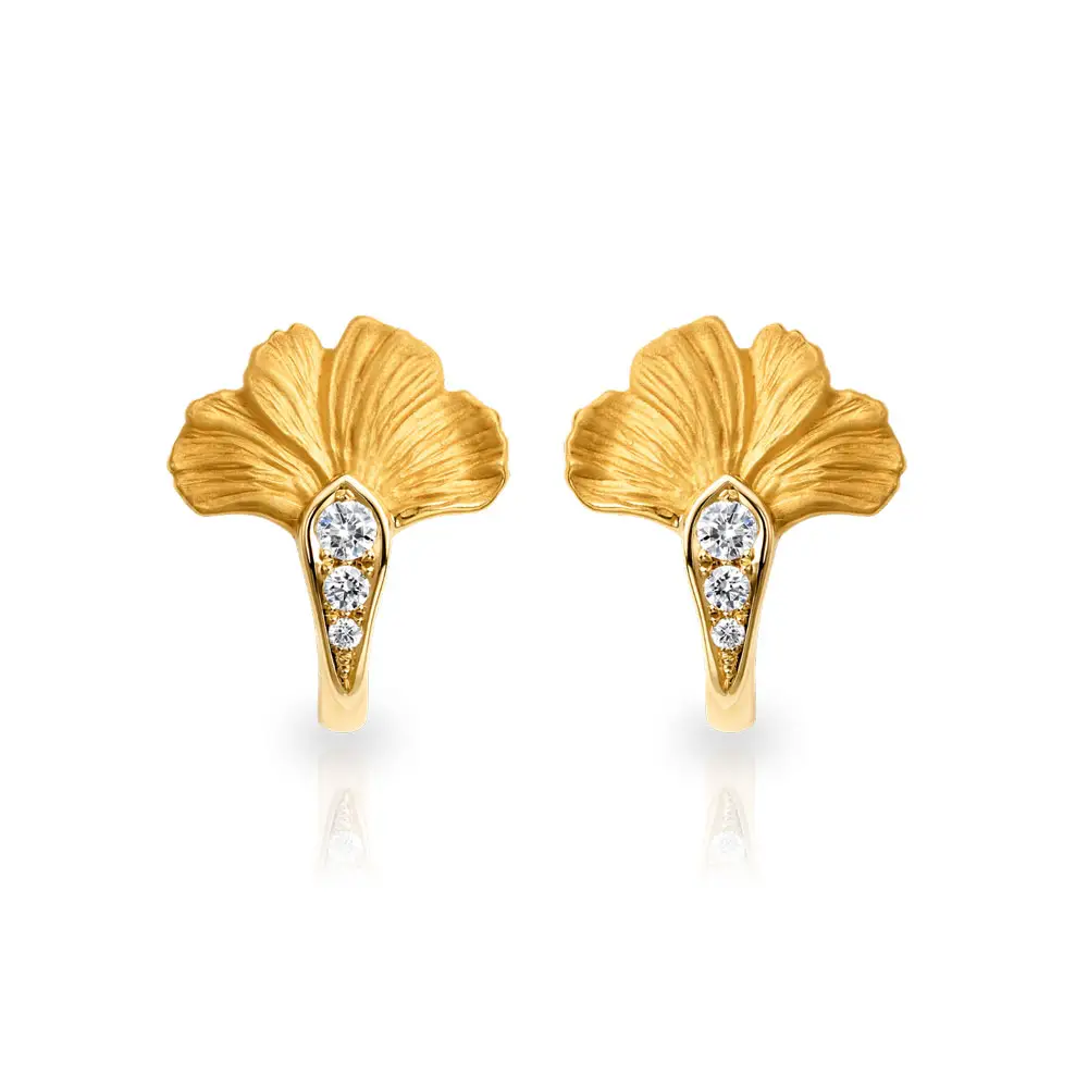 Trung tâm của đôi bông tai được trang trí bằng sáu viên kim cương nhỏ có tổng trọng lượng 0.11 ct, được đính vào phần thuôn nhọn của lá - một chi tiết tinh tế thêm phần lấp lánh cho trang sức mà không làm mất đi vẻ tự nhiên của thiết kế. Thiết kế nhỏ gọn này hoàn hảo cho việc đeo hàng ngày và là phụ kiện sang trọng cho những buổi tối đặc biệt.