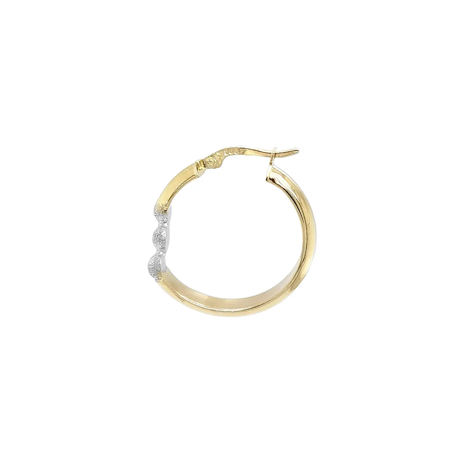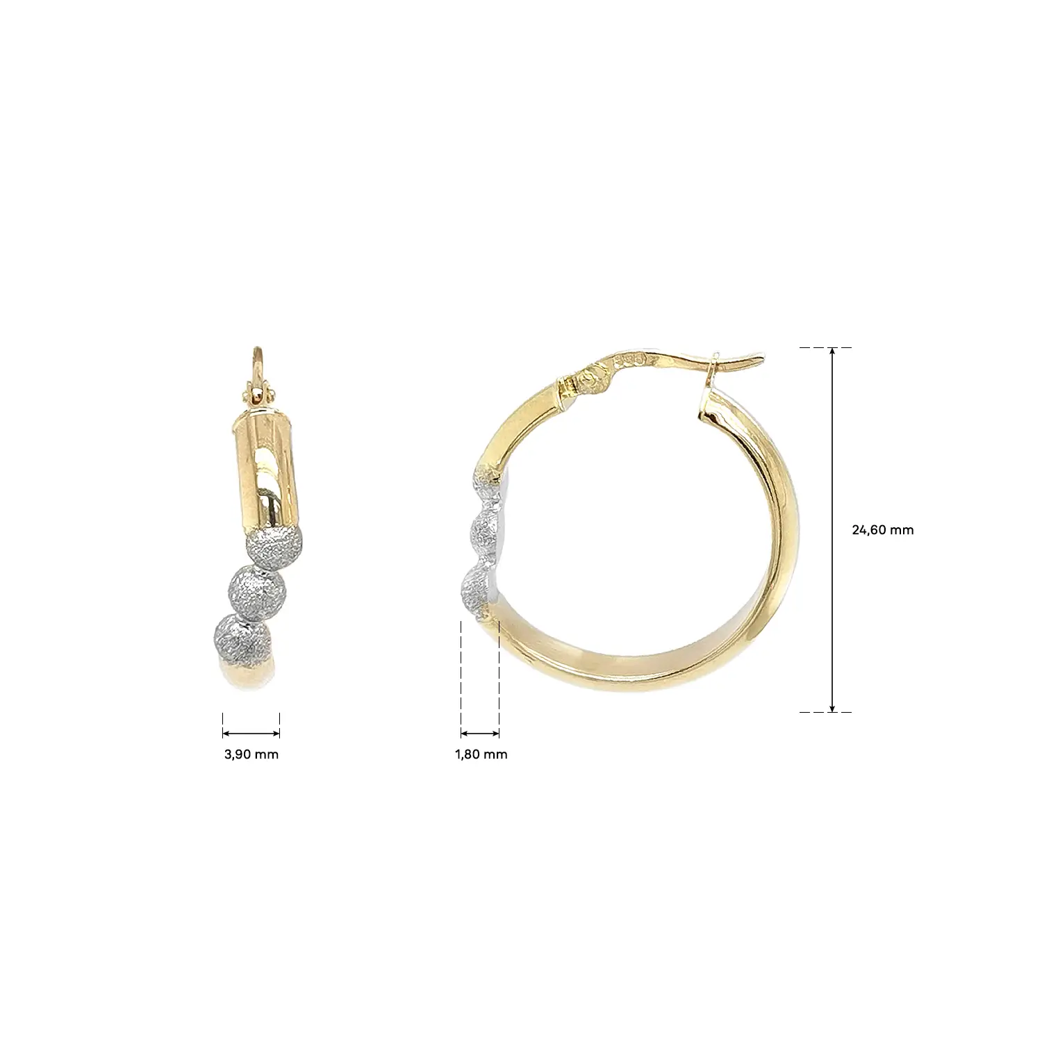 Khuyên tai vòng bằng vàng này kết hợp bề mặt vàng bóng với các bán cầu bằng vàng trắng dạng mờ, tạo nên sự tương phản hiện đại và nữ tính. Đường kính 24,60 mm phù hợp cho cả phong cách hằng ngày lẫn những dịp đặc biệt.