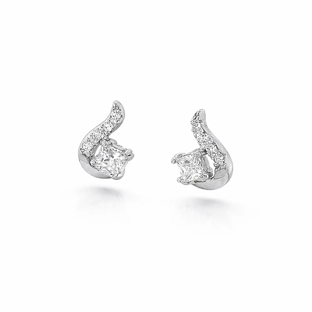Đôi bông tai vàng dạng đinh với họa tiết uốn cong thanh lịch đính zircon gây ấn tượng bởi thiết kế hiện đại cùng đường nét mềm mại, giàu chuyển động. Điểm nhấn là viên zircon cắt vuông ở trung tâm, được bao quanh tinh tế bởi các viên zircon nhỏ hơn sắp xếp theo đường cong uyển chuyển. Tổng thể mang lại cảm giác nhẹ nhàng, tinh xảo nhưng vẫn rất nổi bật.
