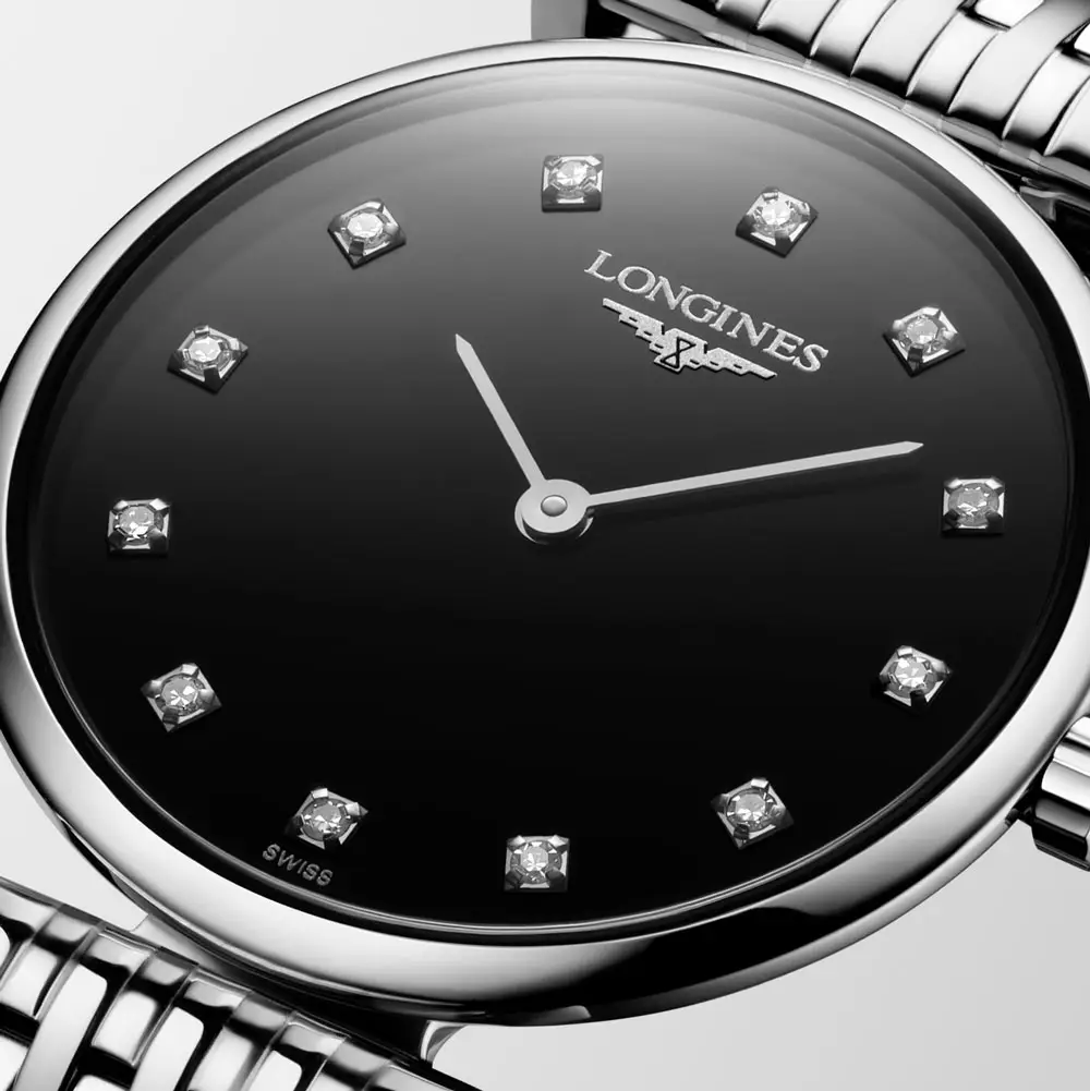 Trên mặt số đen, 12 cọc số kim cương tạo điểm nhấn sang trọng và tôn lên thiết kế tối giản. Kim bạc mảnh mai đảm bảo khả năng hiển thị rõ ràng.