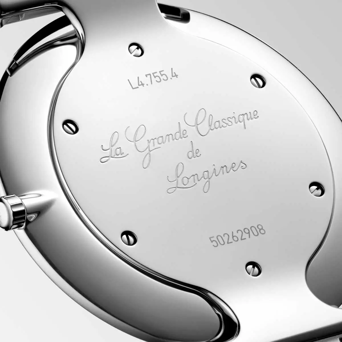 Bên trong là bộ máy quartz Thụy Sĩ L420, mang lại độ chính xác tuyệt đối và độ tin cậy cao. Dây thép không gỉ cùng khóa gập ba lần an toàn đảm bảo sự thoải mái và bền bỉ. Mẫu đồng hồ này thể hiện trọn vẹn tinh thần Longines – truyền thống, thanh lịch và chú trọng từng chi tiết.