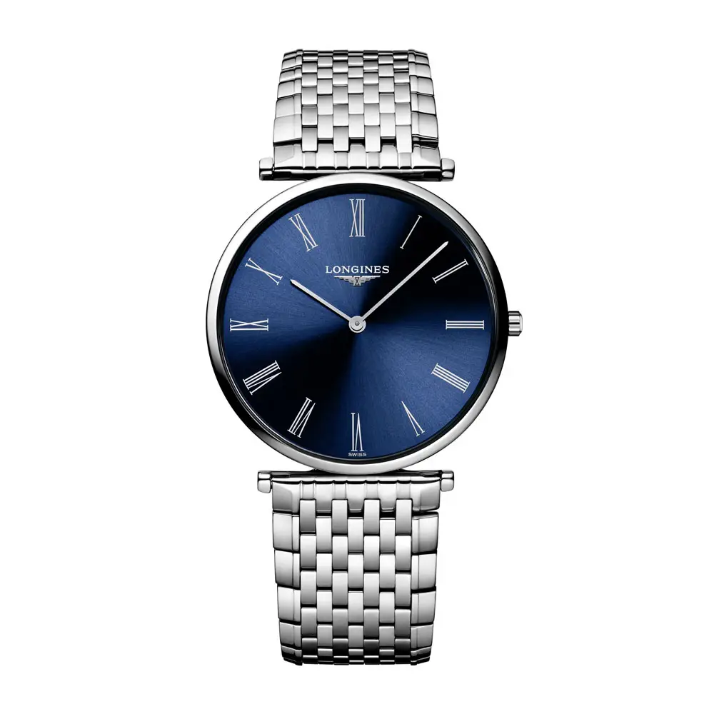 Điểm nhấn chính là mặt số xanh hiệu ứng sunray với các chữ số La Mã, kết hợp cùng kim bạc thanh lịch. Phong cách tối giản tôn vinh thẩm mỹ cổ điển của Longines, biến mẫu đồng hồ này trở thành phụ kiện lý tưởng cho cả dịp trang trọng và sử dụng hằng ngày.