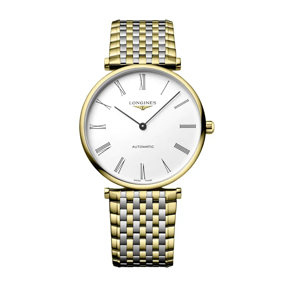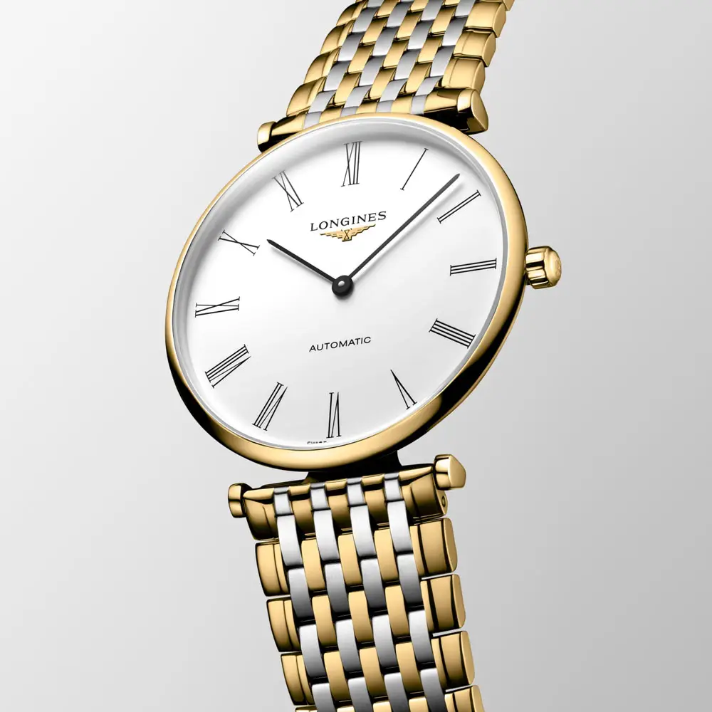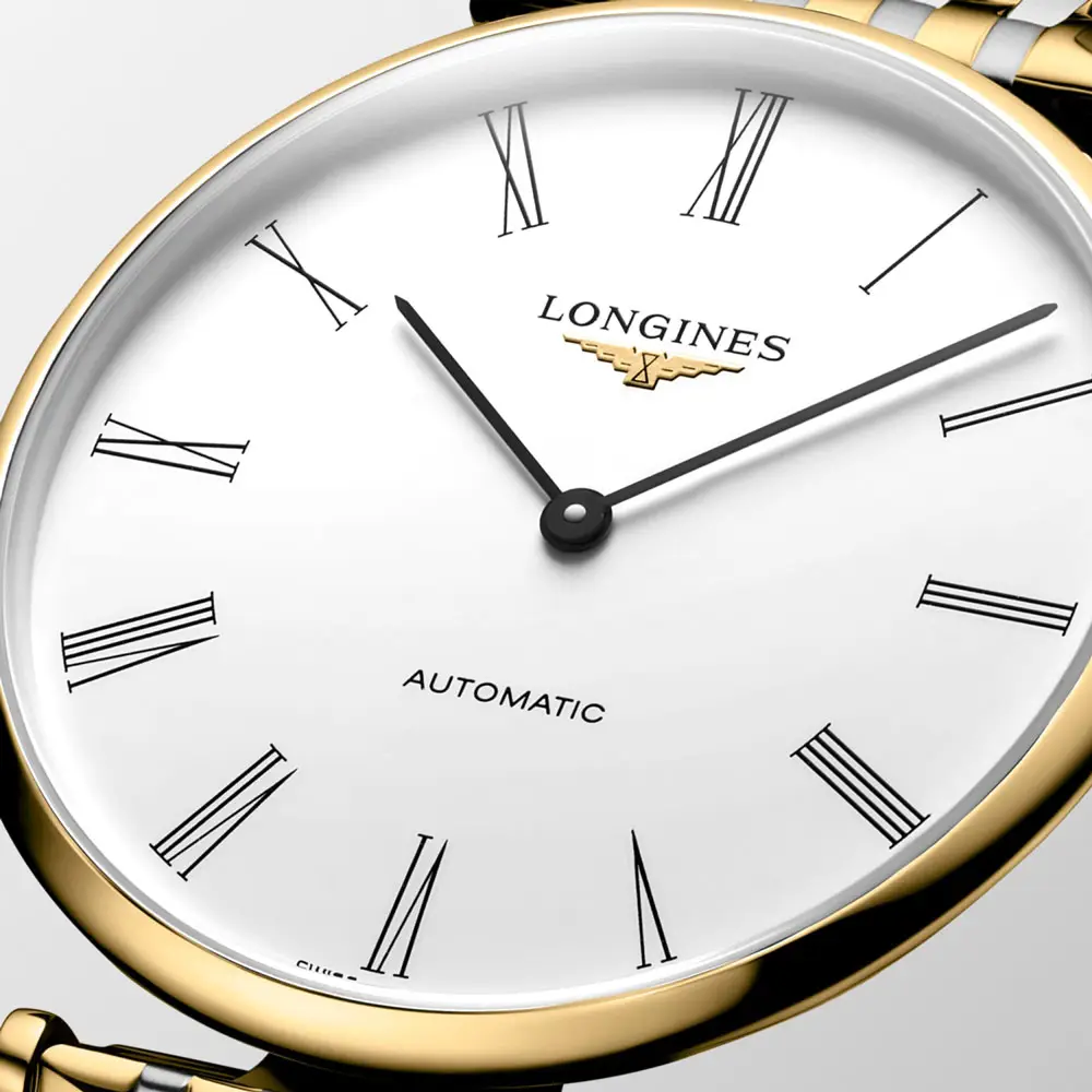 Mặt số trắng với chữ số La Mã màu đen và kim thanh mảnh nhấn mạnh thiết kế vượt thời gian của bộ sưu tập La Grande Classique. Nắp lưng trong suốt cho phép chiêm ngưỡng bộ máy được hoàn thiện tinh xảo, phản ánh di sản Thụy Sĩ của Longines.