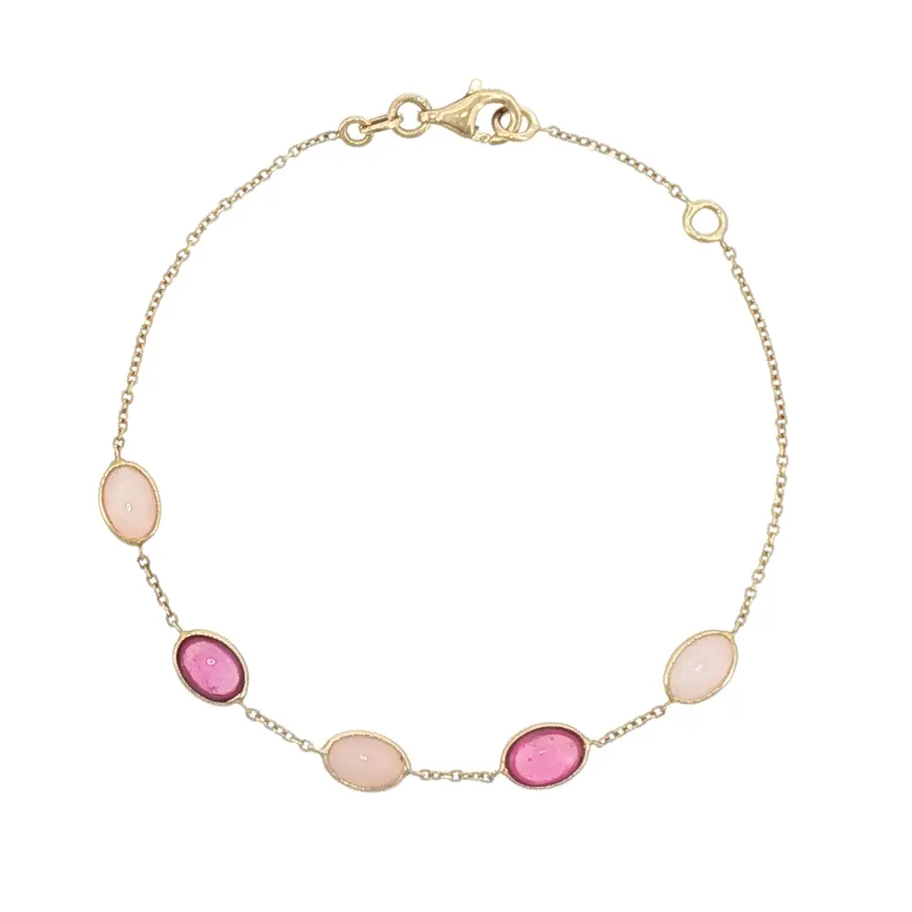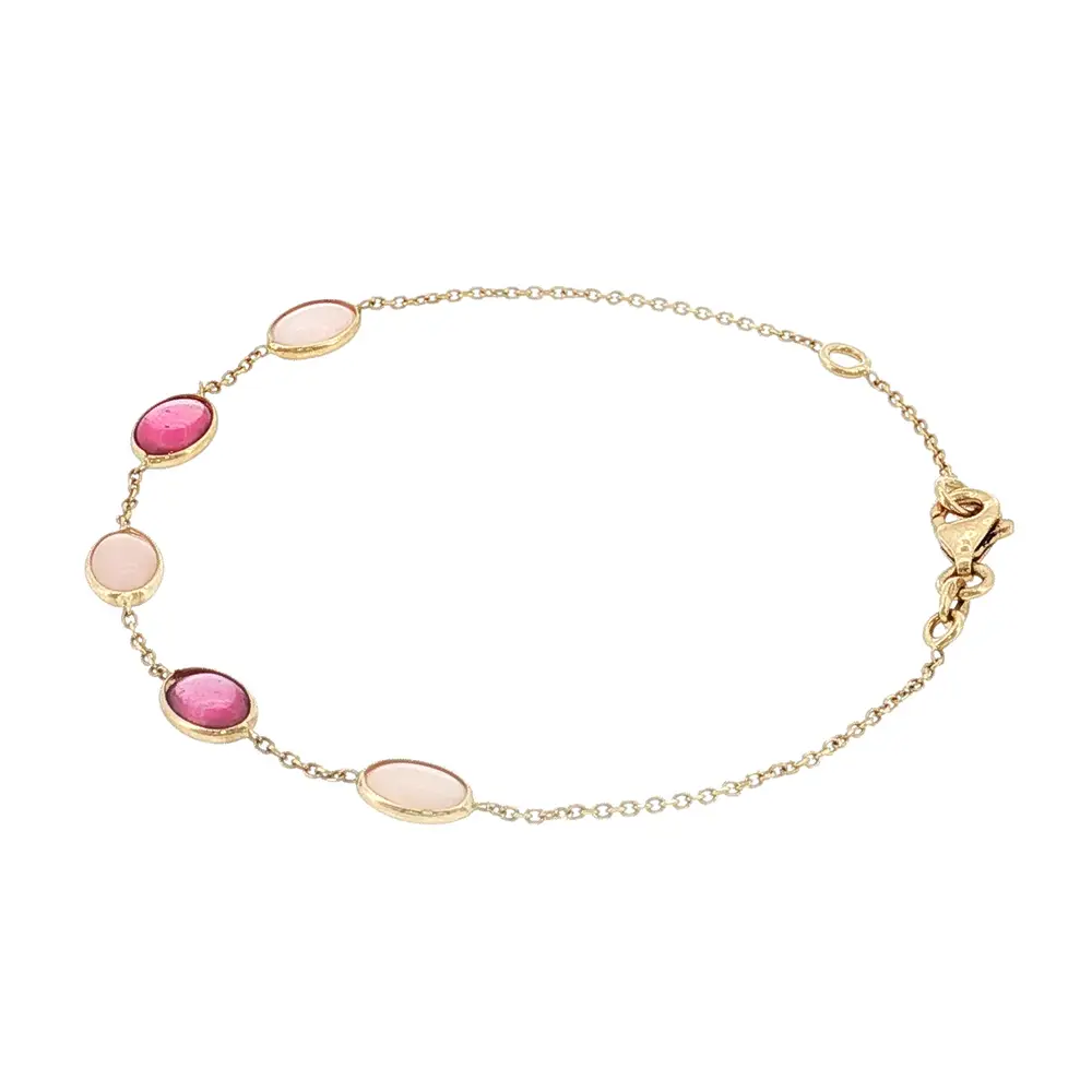 Chiếc lắc tay vàng 14K với đá màu hồng nổi bật với dây mảnh và tông màu nhẹ nhàng. Những viên đá hồng mang đến vẻ đẹp lãng mạn và hiện đại, phù hợp cho cả ngày thường và dịp đặc biệt.