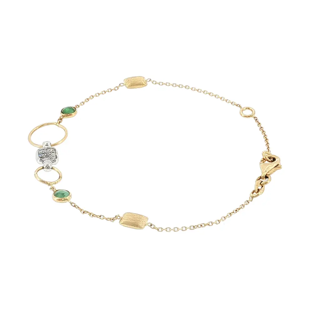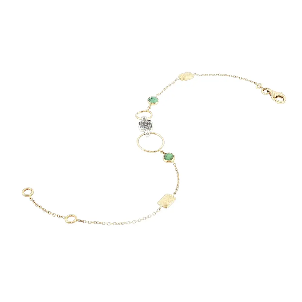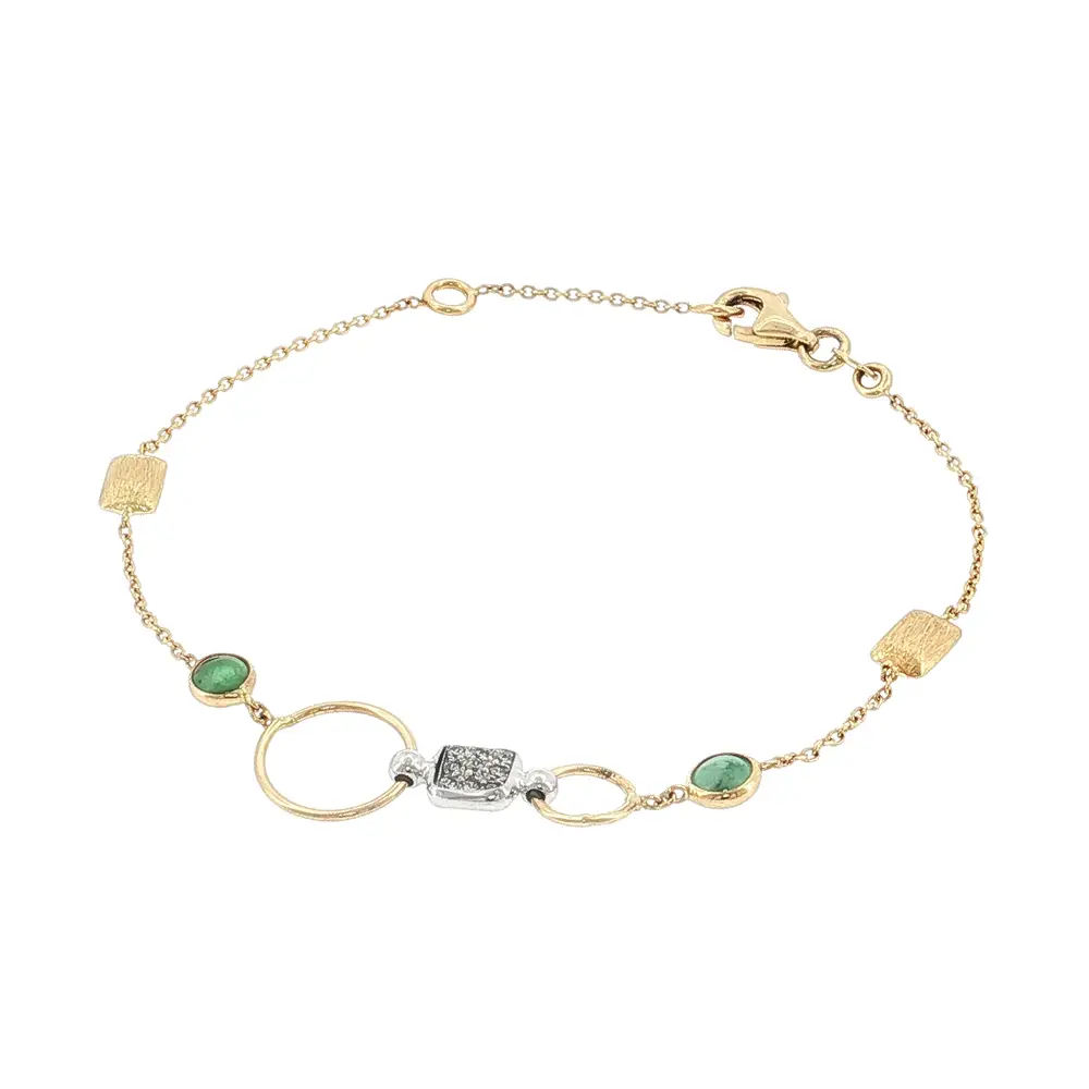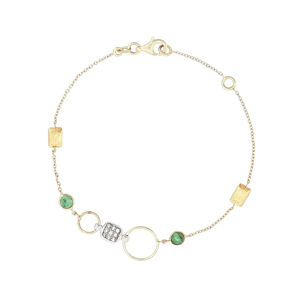 Chiếc lắc tay vàng 14K với đá xanh và zirconia lấp lánh nổi bật với thiết kế tinh tế và hiện đại. Sự kết hợp giữa sắc xanh tươi và độ sáng tạo nên vẻ ngoài hài hòa.