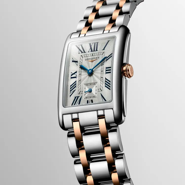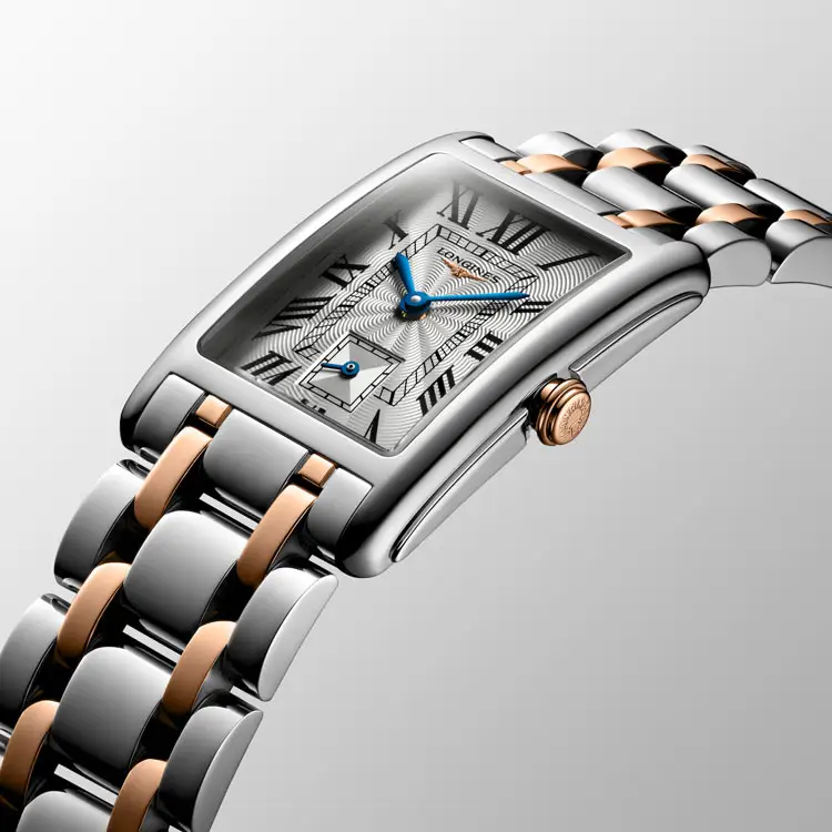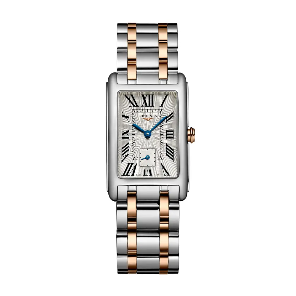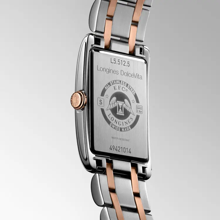 Longines DolceVita L5.512.5.71.7 là mẫu đồng hồ nữ mang vẻ đẹp thanh lịch vượt thời gian, lấy cảm hứng từ thiết kế chữ nhật cổ điển. Vỏ thép không gỉ 23,30 × 37,00 mm kết hợp cùng núm vặn bằng vàng hồng 18K, tạo điểm nhấn tinh tế và sang trọng.
