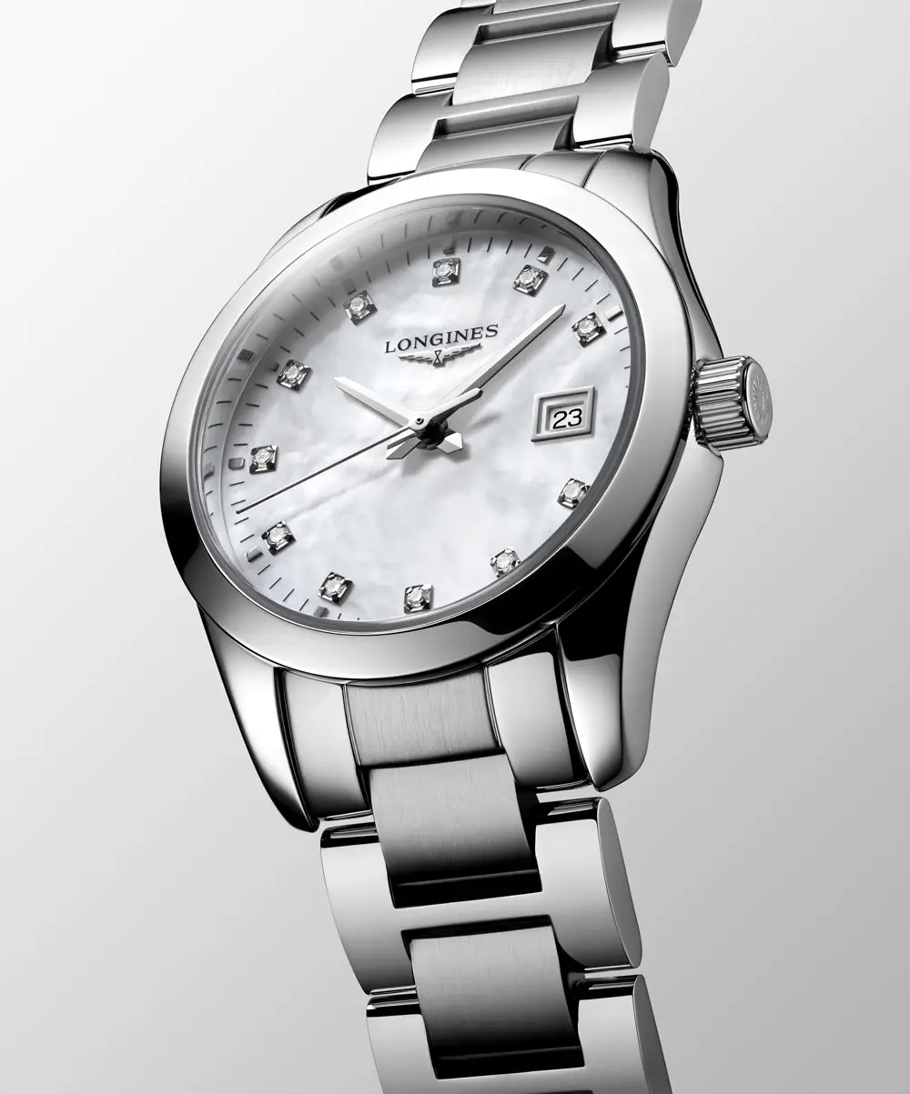 Longines Conquest Classic L2.286.4.87.6 là mẫu đồng hồ nữ kết hợp sự thanh lịch tinh tế và chi tiết trang sức cùng độ chính xác của chế tác Thụy Sĩ. Vỏ thép không gỉ 29,5 mm bao quanh mặt số khảm xà cừ, được đính 11 viên kim cương làm cọc giờ, tạo nên vẻ lấp lánh sang trọng. Ô lịch ngày đặt tại vị trí 3 giờ.