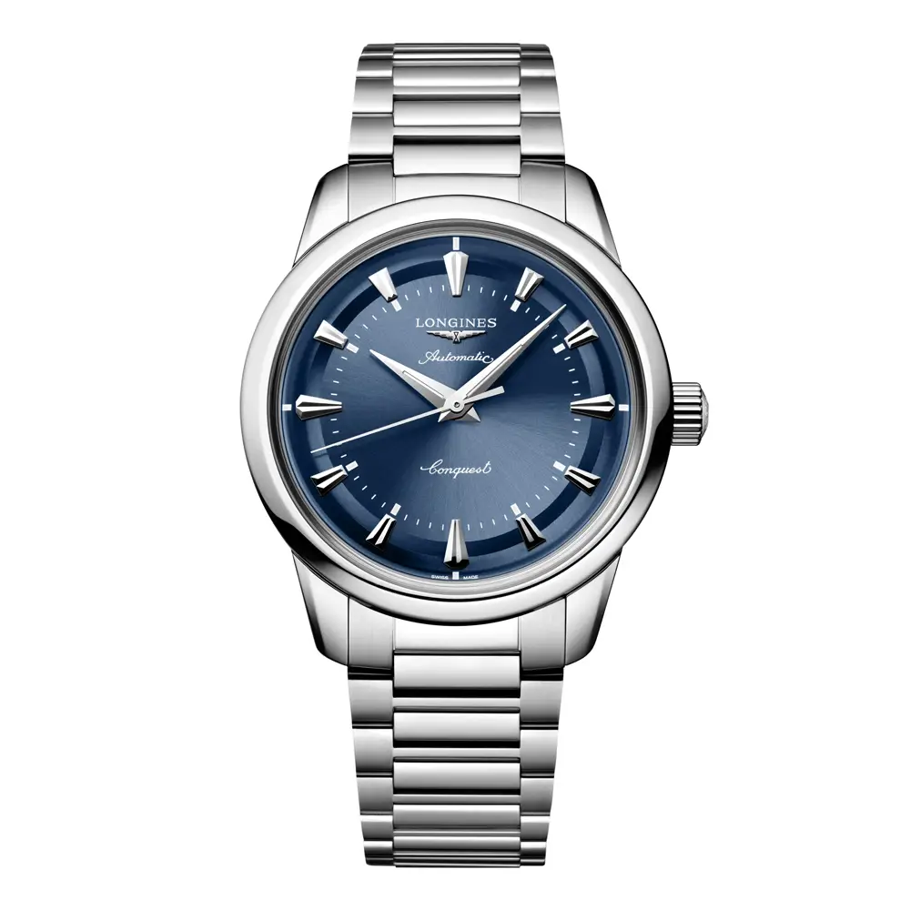 Longines Conquest Heritage L1.649.4.92.6 kết hợp hài hòa giữa vẻ đẹp cổ điển thập niên 1950 và kỹ thuật chế tác hiện đại. Vỏ thép 38 mm mang lại sự cân đối và thanh lịch, phù hợp cho cả nam và nữ. Mặt số xanh lam hiệu ứng sunburst tạo chiều sâu thị giác và ánh sắc tinh tế, trong khi núm vặn dạng xoáy và khóa bướm thể hiện sự hoàn thiện cao cấp.
