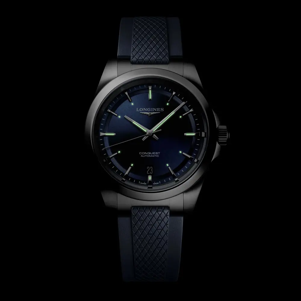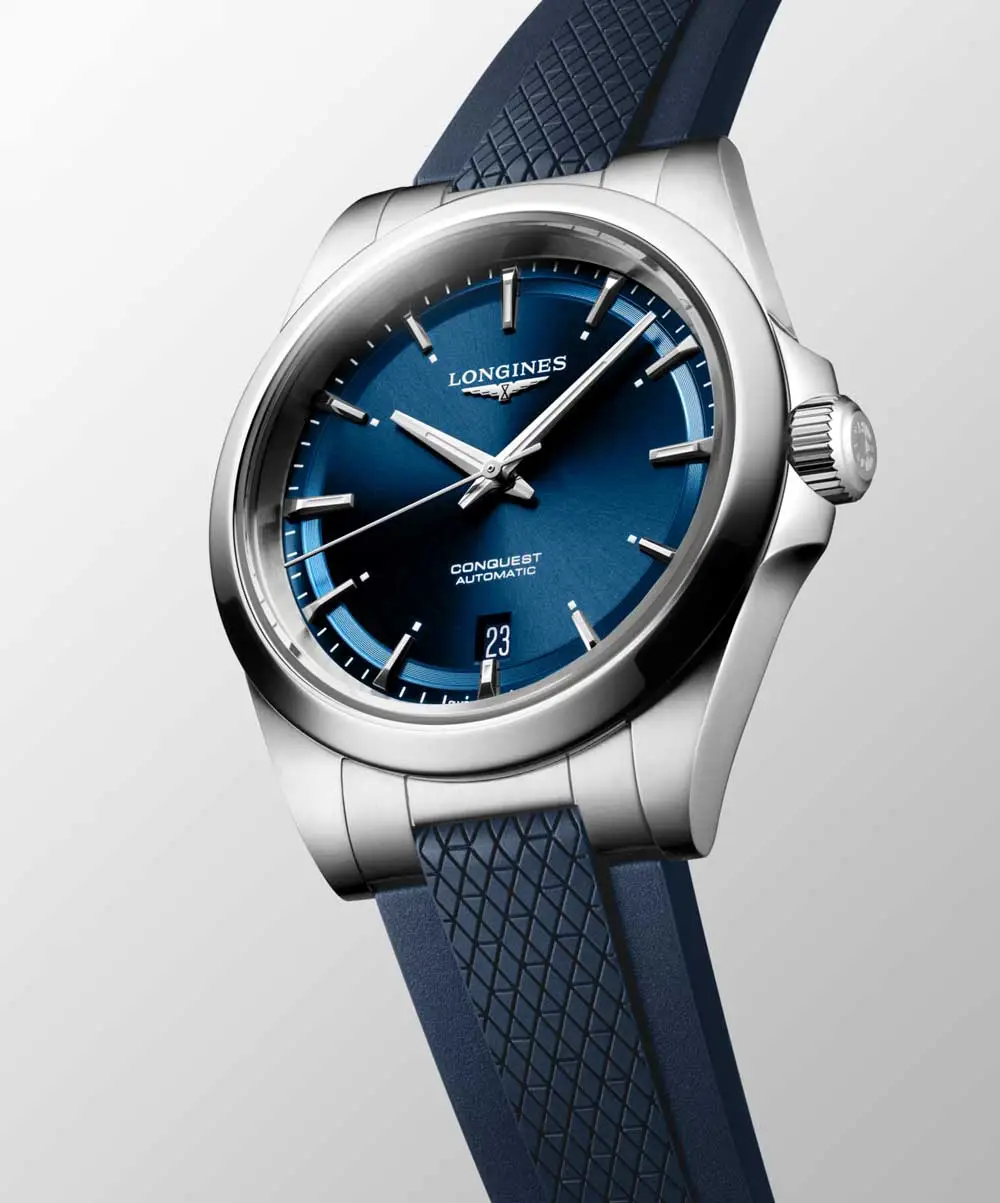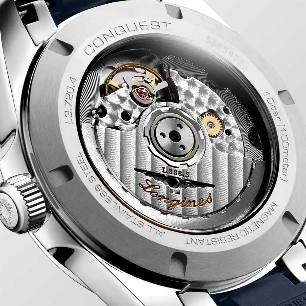 Bên trong là bộ máy tự động L888.5 mạnh mẽ với dự trữ năng lượng lên đến 72 giờ, được trang bị sợi silicon để tăng khả năng chống từ tính. Đồng hồ được trang bị dây đeo cao su màu xanh dương với khóa gập và hệ thống điều chỉnh vi mô, đảm bảo sự thoải mái ngay cả khi tham gia các hoạt động thể thao. Longines Conquest vì vậy mang đến hiệu suất đáng tin cậy, phong cách vượt thời gian và độ chính xác Thụy Sĩ trong một thiết kế hoàn hảo.