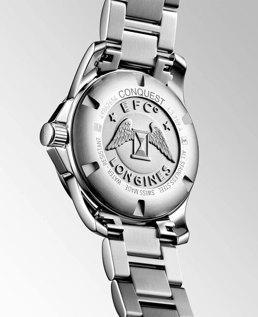 Bên trong là bộ máy quartz L157 chính xác, mang lại độ chuẩn xác cao và vận hành dễ dàng. Hoàn thiện với dây thép cùng khóa gập ba lần an toàn, đồng hồ kết hợp sự thoải mái, chắc chắn và phong cách thể thao thanh lịch. Đây là hiện thân hoàn hảo cho triết lý Conquest – độ bền, hiệu suất và truyền thống Thụy Sĩ.