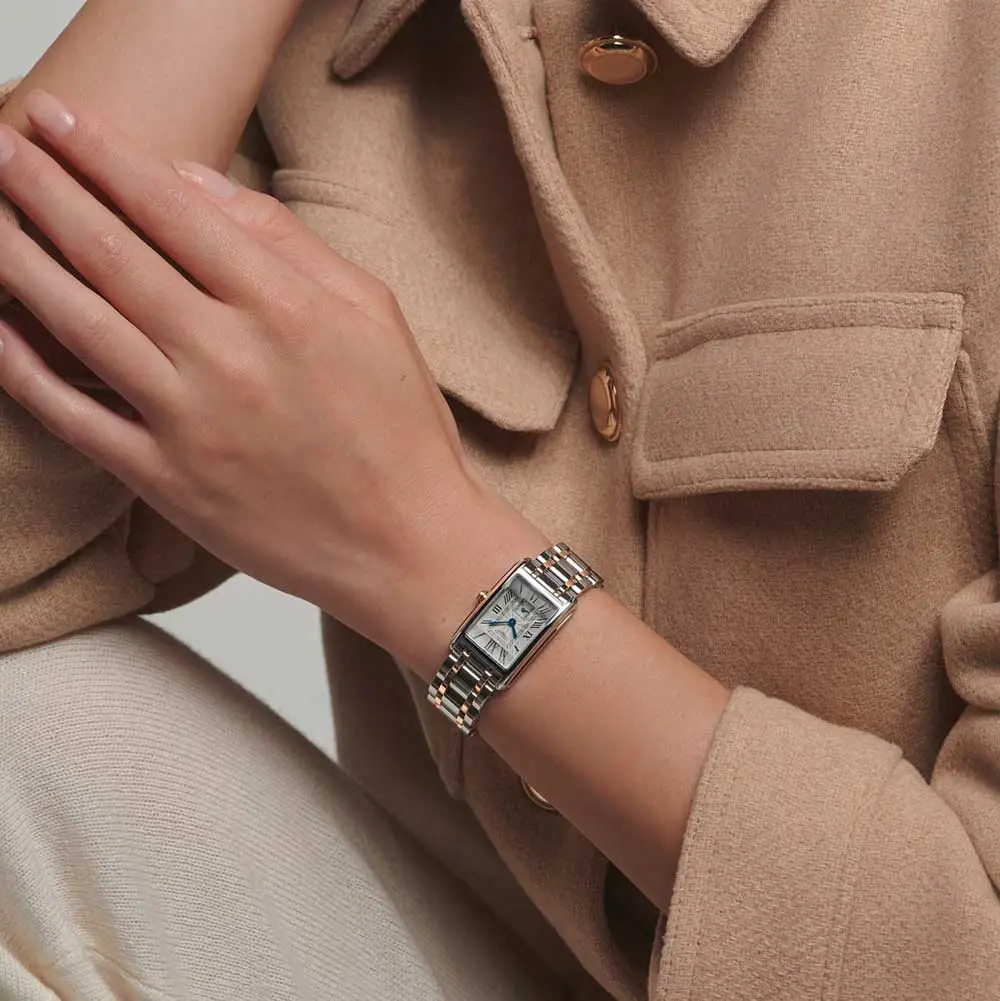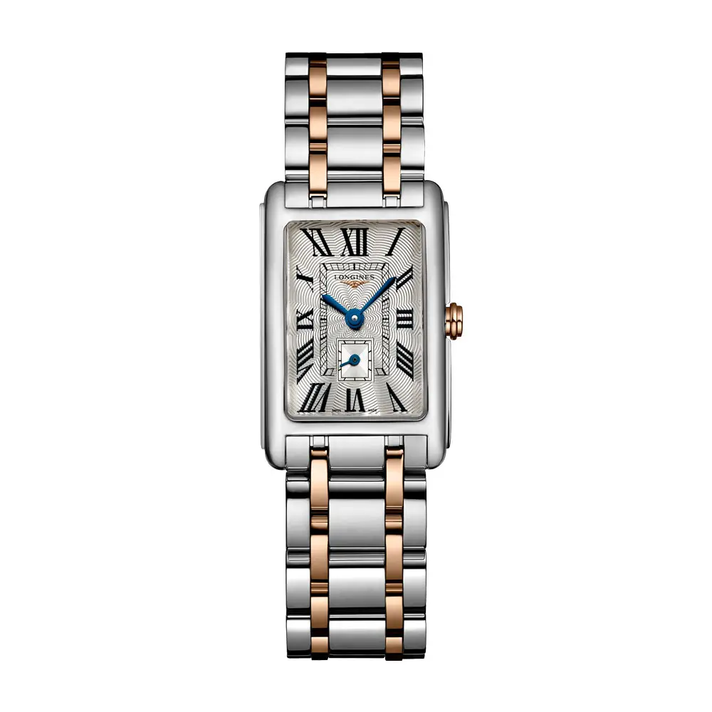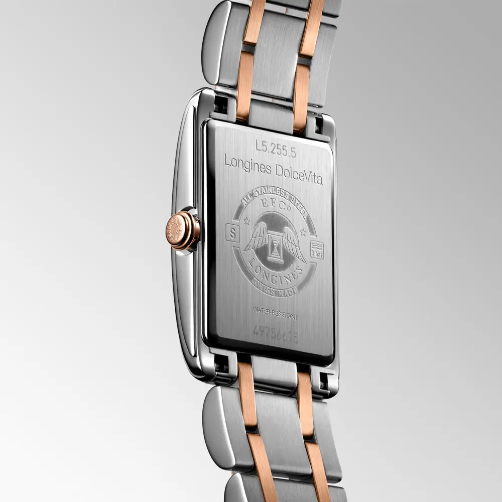 Longines DolceVita L5.255.5.71.7 là mẫu đồng hồ nữ thanh lịch với thiết kế hai tông màu, kết hợp sự tinh tế của bộ sưu tập DolceVita với nét đẹp vượt thời gian. Vỏ thép không gỉ 20,80 × 32,00 mm kết hợp cùng núm vặn bằng vàng hồng 18K, mặt số bạc “flinqué” với số La Mã và kim xanh, tạo nên phong cách cổ điển.
