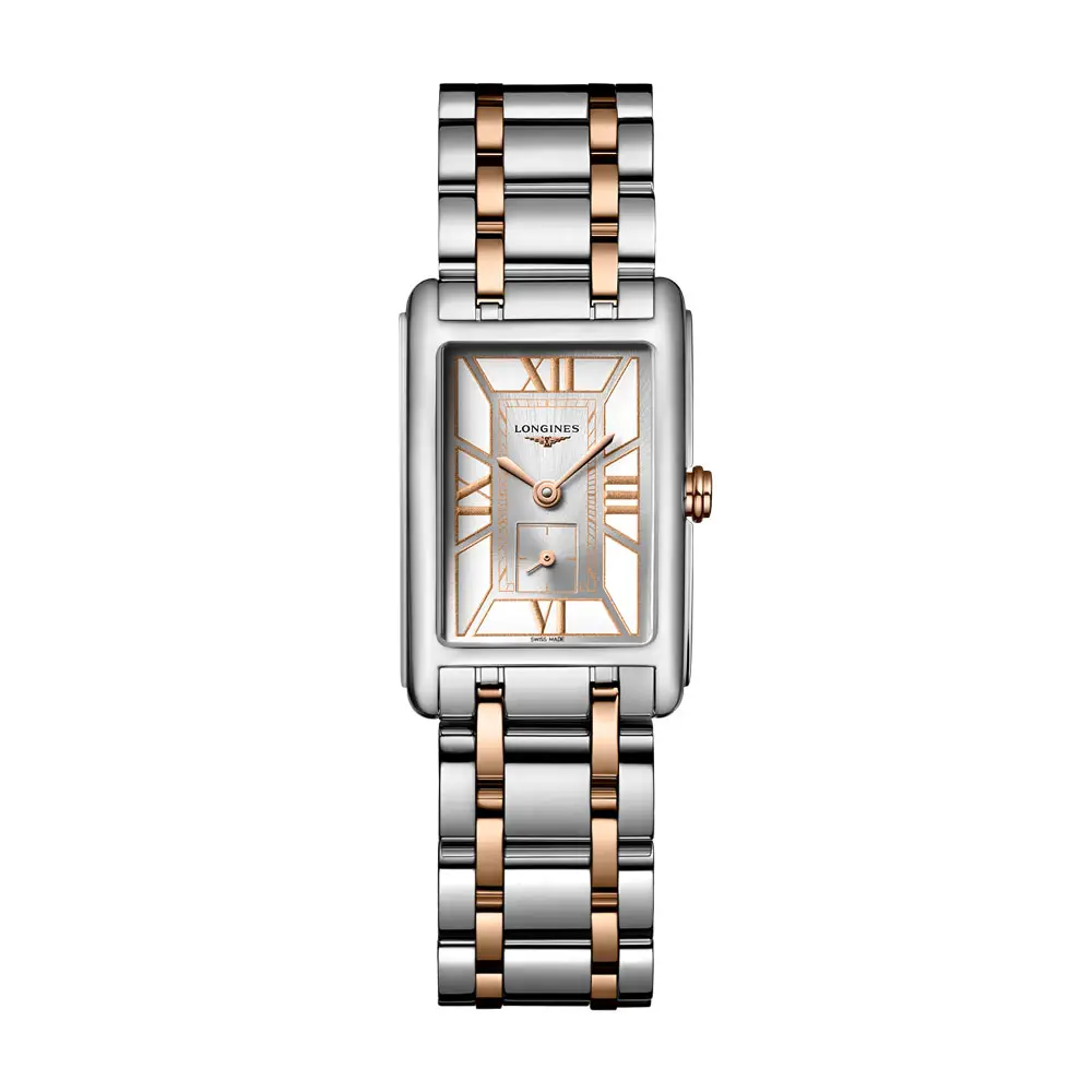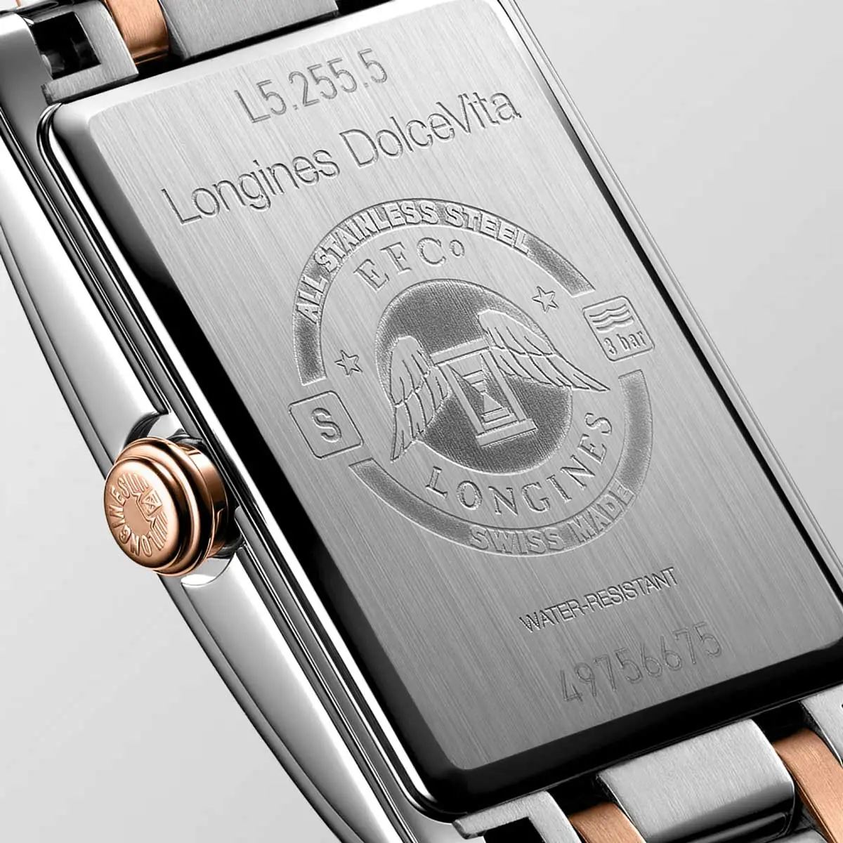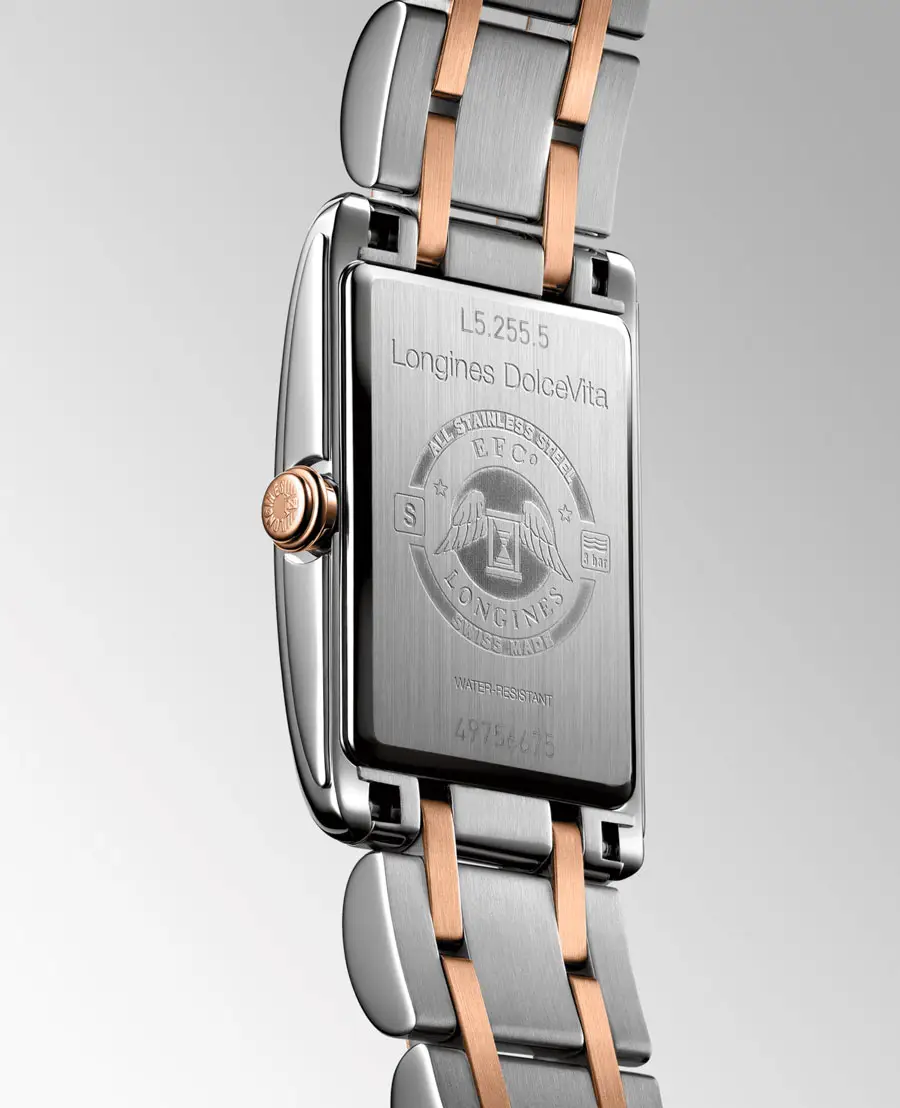 Longines DolceVita L5.255.5.75.7 là mẫu đồng hồ nữ nhỏ gọn, kết hợp sự thanh lịch của bộ sưu tập DolceVita với thiết kế hai tông màu tinh tế. Vỏ thép không gỉ 20,80 × 32,00 mm kết hợp cùng núm vặn bằng vàng hồng 18K, mặt số bạc họa tiết “flinqué” với số La Mã và kim xanh, tạo nên phong cách cổ điển.