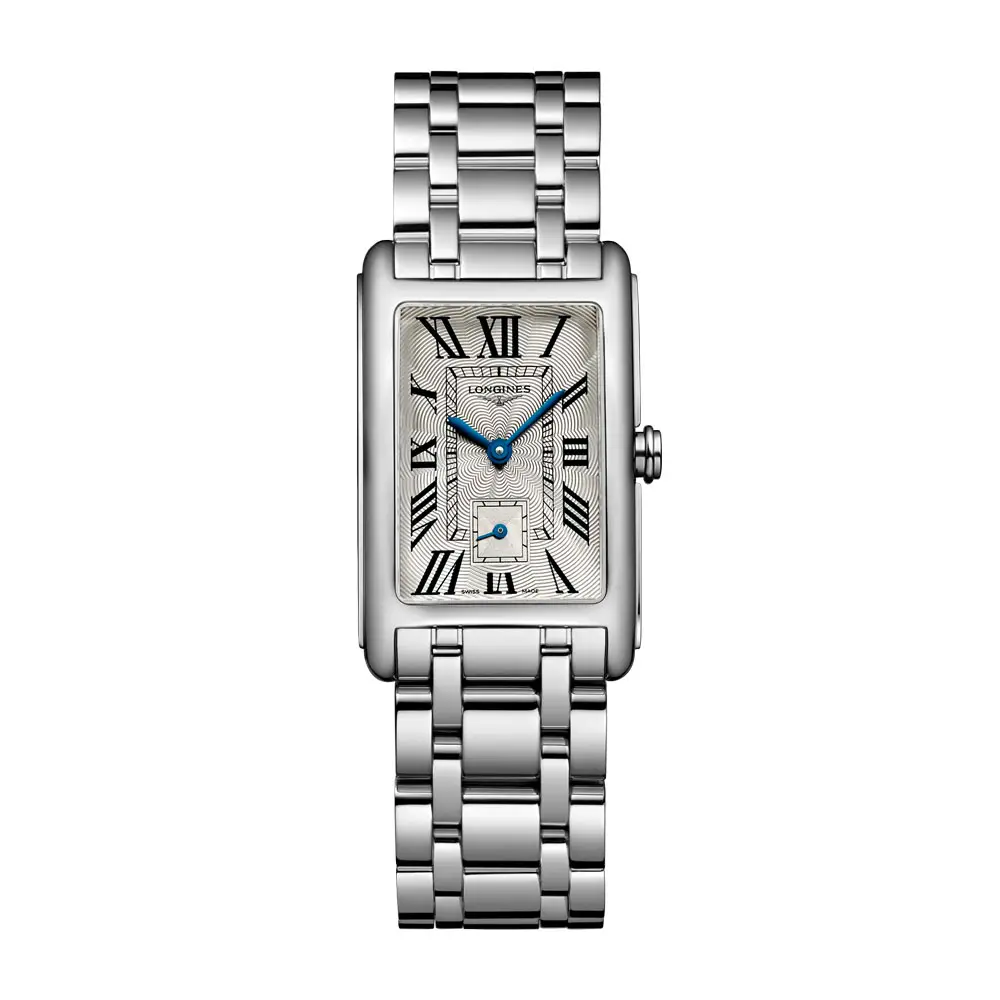 Longines DolceVita L5.512.4.71.6 là mẫu đồng hồ nữ với dáng chữ nhật đặc trưng, kết hợp sự thanh lịch cổ điển với phong cách hiện đại. Vỏ thép không gỉ 23,30 × 37,00 mm bao quanh mặt số bạc họa tiết “flinqué” với số La Mã và kim xanh, tạo nên vẻ đẹp vượt thời gian của bộ sưu tập DolceVita.