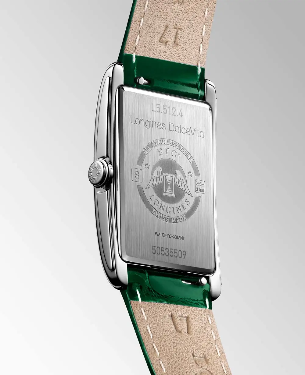Longines DolceVita L5.512.4.71.A là mẫu đồng hồ nữ thanh lịch, kết hợp nét đẹp vượt thời gian với sự tinh tế của bộ sưu tập DolceVita. Vỏ thép không gỉ 23,30 × 37,00 mm ôm lấy mặt số bạc họa tiết “flinqué” với số La Mã và kim xanh, tạo nên phong cách cổ điển.