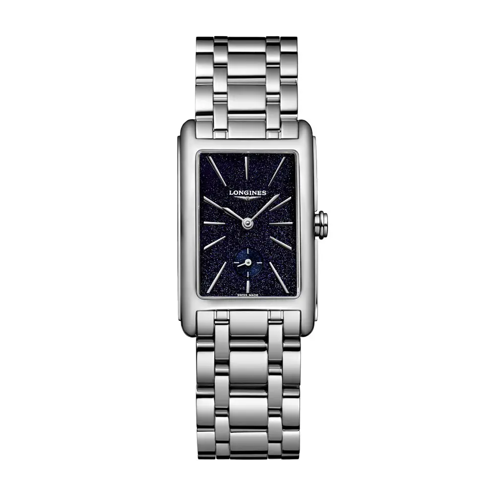 Longines DolceVita L5.512.4.93.6 là mẫu đồng hồ nữ kết hợp thiết kế chữ nhật thanh lịch với tông màu hiện đại. Vỏ thép không gỉ 23,30 × 37,00 mm ôm lấy mặt số xanh đậm với cọc số thanh mảnh và mặt số phụ giây nhỏ tại vị trí 6 giờ, tạo nên nét độc đáo.