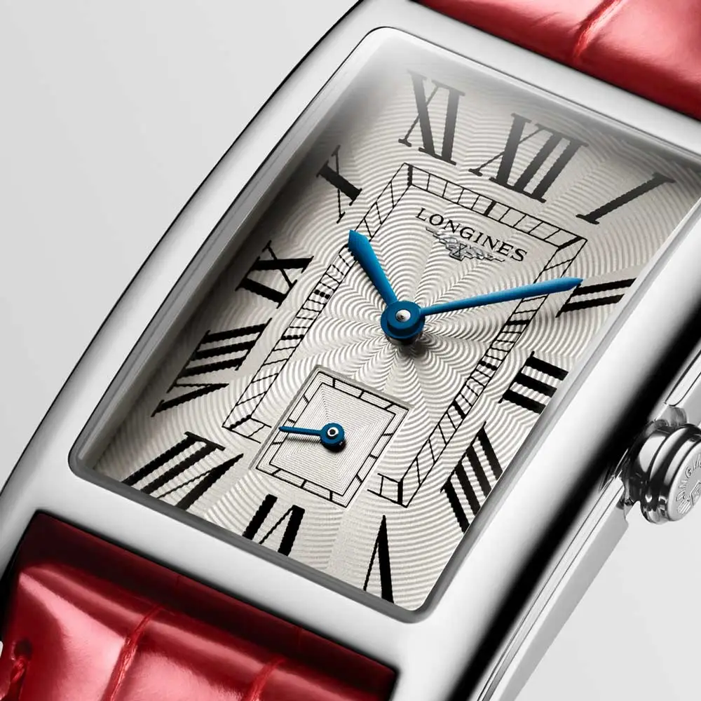 Longines DolceVita L5.755.4.71.5 là mẫu đồng hồ nữ cỡ trung, thể hiện sự thanh lịch vượt thời gian của bộ sưu tập DolceVita. Vỏ thép không gỉ 26,1 × 42,0 mm ôm lấy mặt số bạc họa tiết “flinqué” với số La Mã và kim xanh, mang lại vẻ đẹp cổ điển, tinh tế.