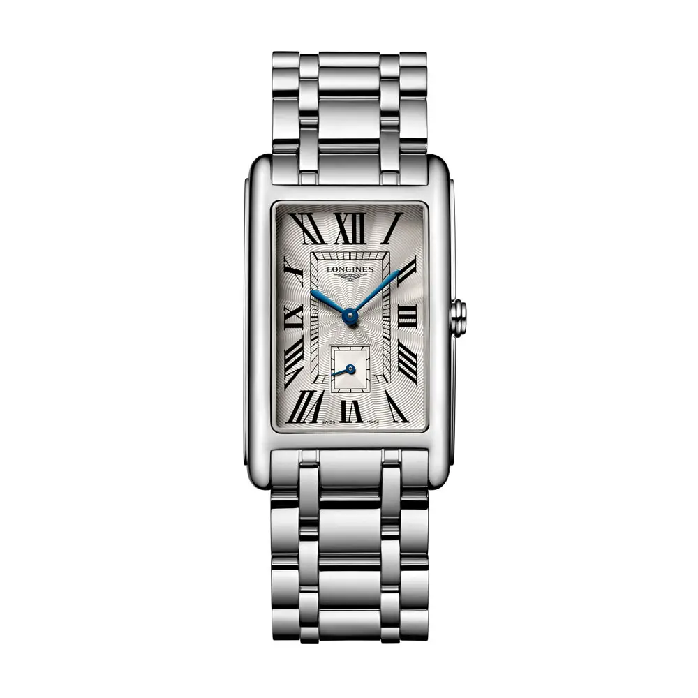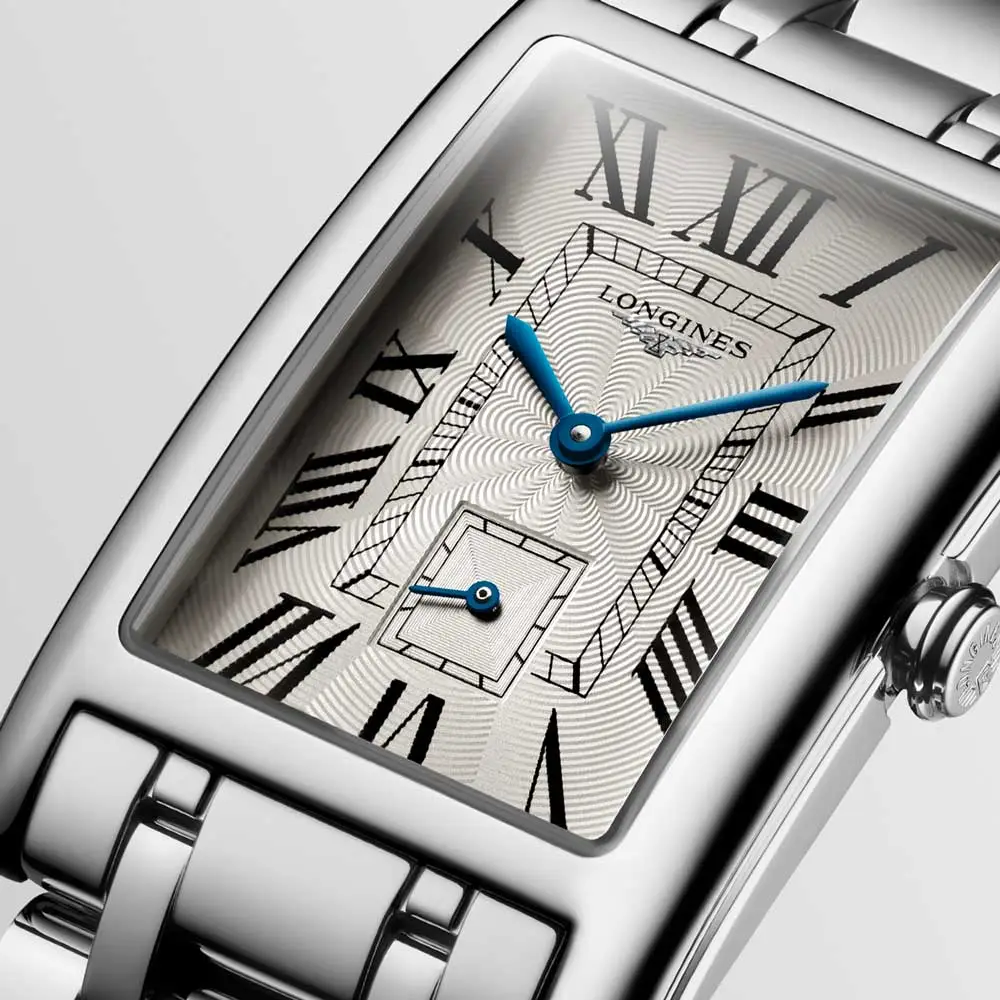 Longines DolceVita L5.755.4.71.6 là mẫu đồng hồ nữ cỡ trung, kết hợp thiết kế chữ nhật cổ điển với vẻ đẹp thanh lịch vượt thời gian. Vỏ thép không gỉ 26,1 × 42,0 mm ôm lấy mặt số bạc họa tiết “flinqué” với số La Mã và kim xanh, mang lại vẻ ngoài sang trọng, tinh tế.