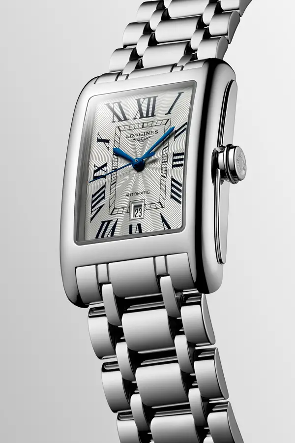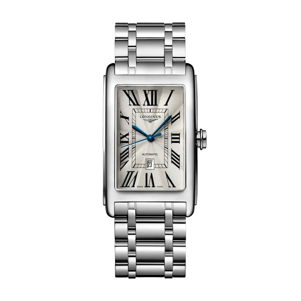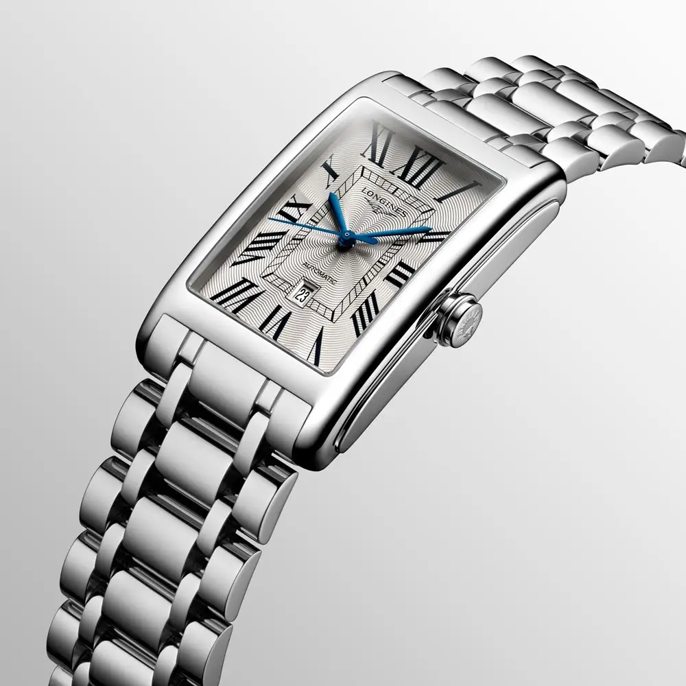 Longines DolceVita L5.767.4.71.6 là mẫu đồng hồ nam, kết hợp thiết kế chữ nhật cổ điển với bộ máy cơ học hiện đại. Vỏ thép không gỉ 28,20 × 47,00 mm bao quanh mặt số bạc “flinqué” với số La Mã và kim xanh, tôn lên vẻ đẹp vượt thời gian của bộ sưu tập DolceVita.