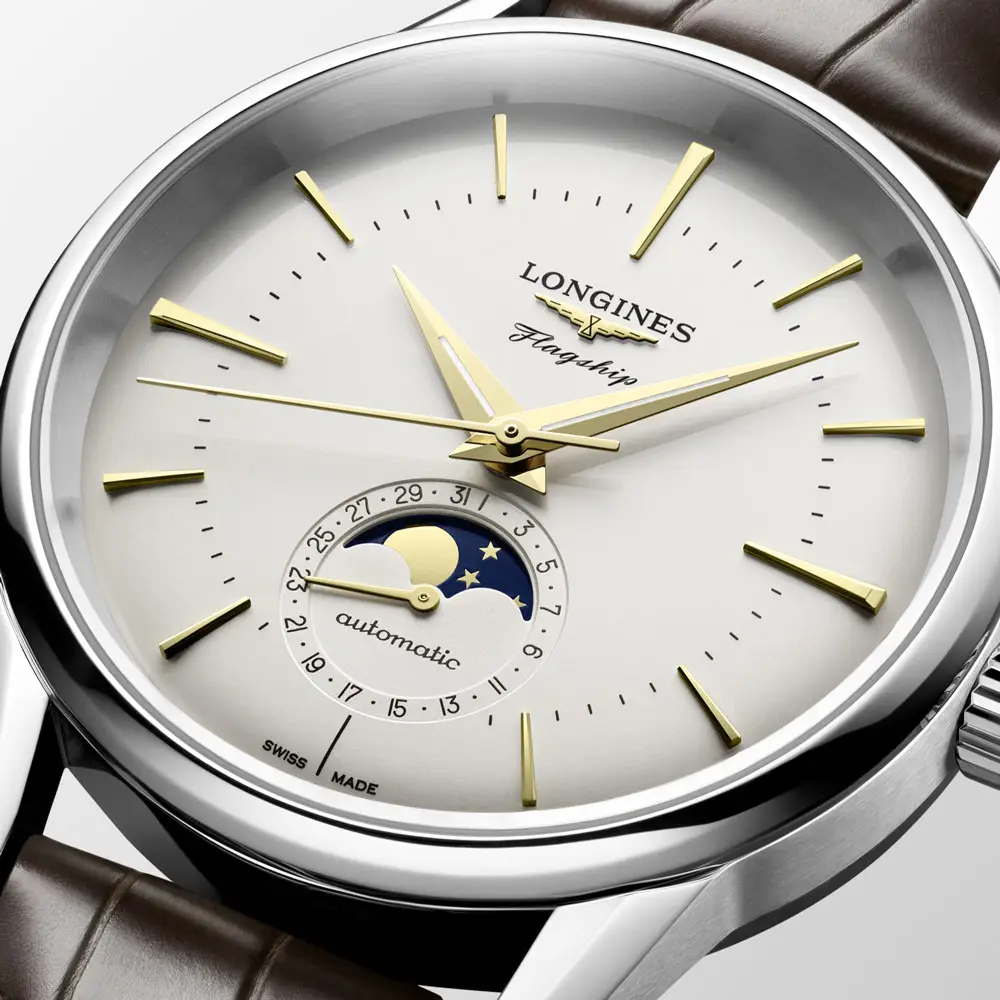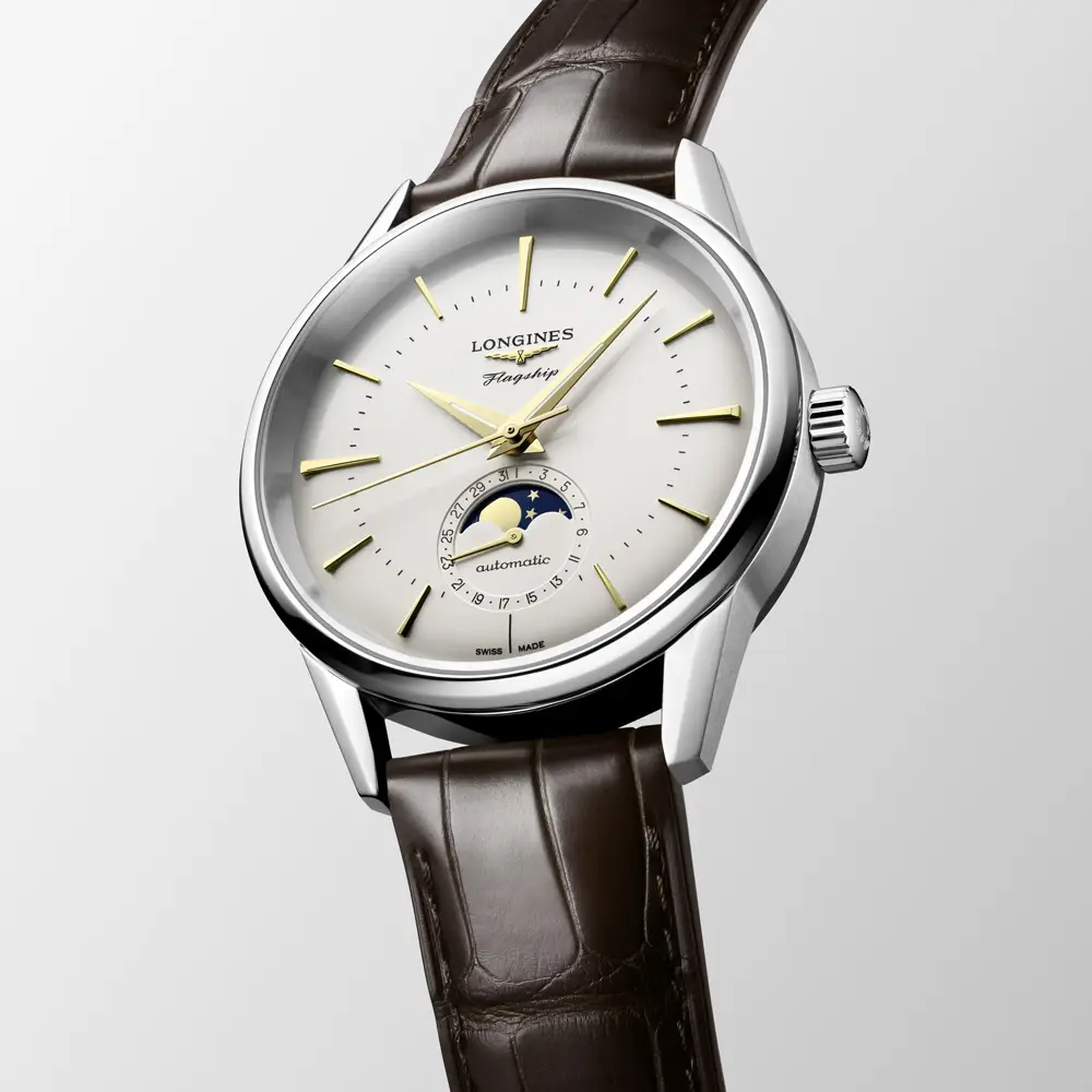 Longines Flagship Heritage L4.815.4.78.2 kết hợp tinh tế giữa vẻ đẹp di sản cổ điển và kỹ thuật cơ khí hiện đại. Vỏ thép 38,5 mm mang lại sự cân đối và thanh lịch trên cổ tay, trong khi mặt số màu kem với lịch tuần trăng và lịch ngày, cùng họa tiết barleycorn, tạo nên vẻ đẹp cổ điển đầy tinh xảo.