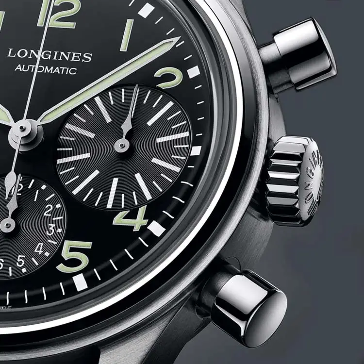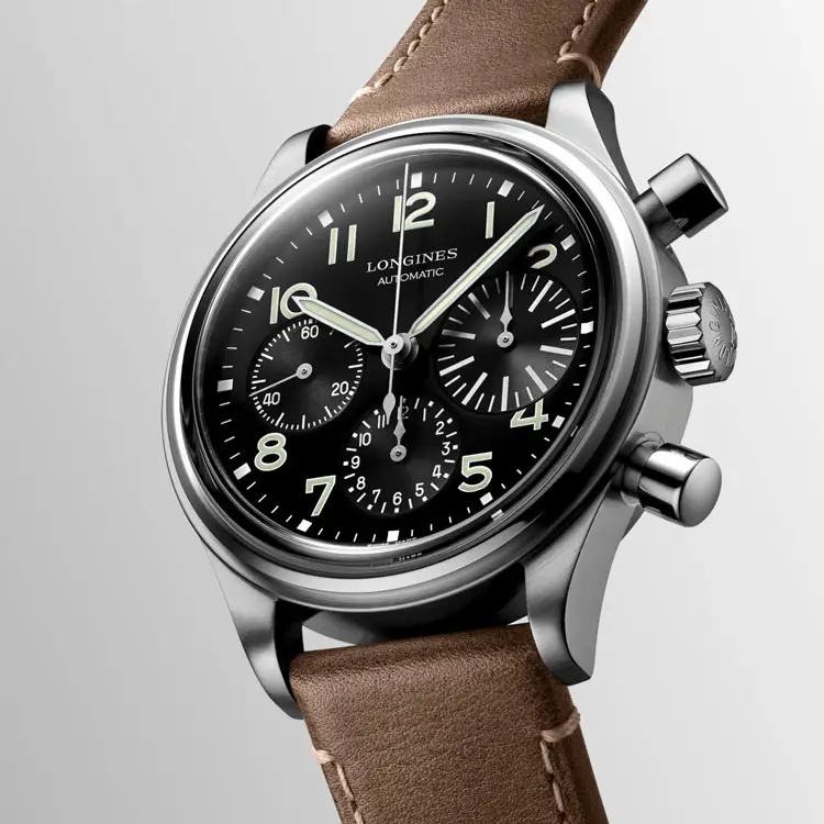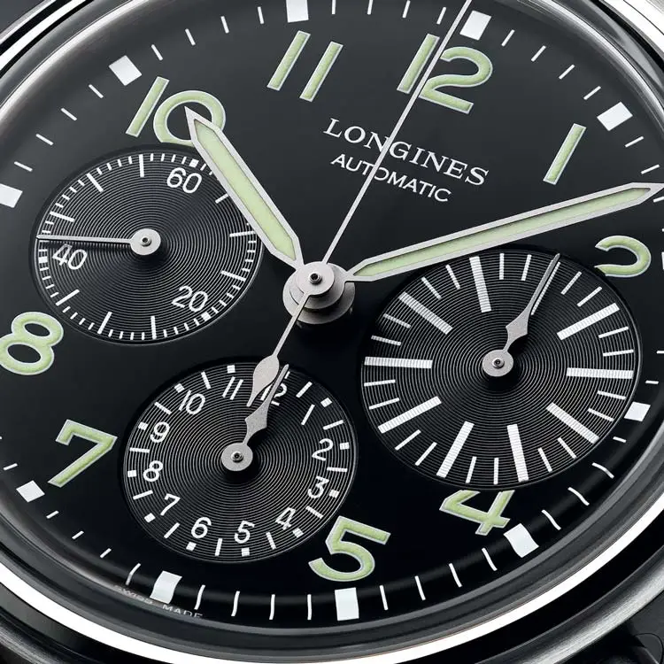 Vỏ thép không gỉ 41 mm được đánh bóng tinh tế, bao bọc mặt số đen mờ với các chữ số Ả Rập lớn và kim phủ Super-LumiNova®, giúp dễ đọc trong mọi điều kiện ánh sáng. Điểm nhấn đặc trưng của mẫu này là ô đếm 30 phút cỡ lớn ở vị trí 3 giờ – chi tiết mang tên BigEye. Đồng hồ vận hành bởi bộ máy cơ tự động Longines L688 với dự trữ năng lượng 66 giờ, được bảo vệ bằng kính sapphire chống phản chiếu.