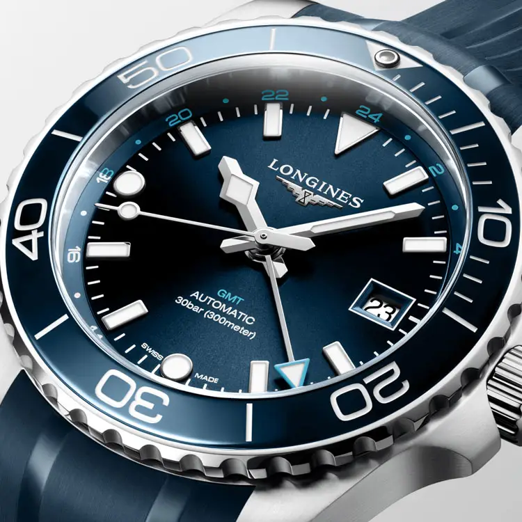 Với khả năng chống nước lên đến 30 ATM (300 mét), chiếc đồng hồ này sẵn sàng cho cả lặn sâu. Dây cao su màu xanh với khóa gập an toàn mang lại sự thoải mái và chắc chắn khi đeo. Longines HydroConquest GMT L3.790.4.96.9 là lựa chọn lý tưởng cho những ai muốn có công cụ mạnh mẽ trong dáng vẻ thanh lịch.