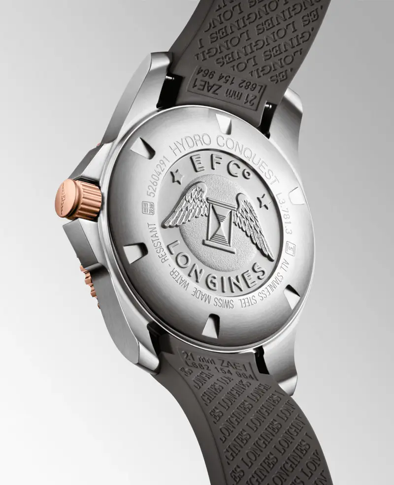 Bên trong là bộ máy automatic L888 với dự trữ năng lượng 72 giờ, tần số 25.200 vph, khẳng định độ tin cậy của chế tác Thụy Sĩ. Hoàn thiện với dây cao su xám cùng khóa gập đôi an toàn, HydroConquest L3.781.3.78.9 thể hiện hiệu suất, độ bền bỉ và truyền thống chế tác đồng hồ Thụy Sĩ.