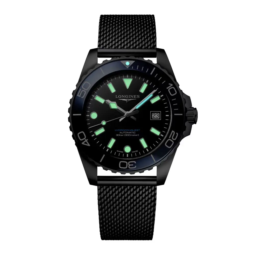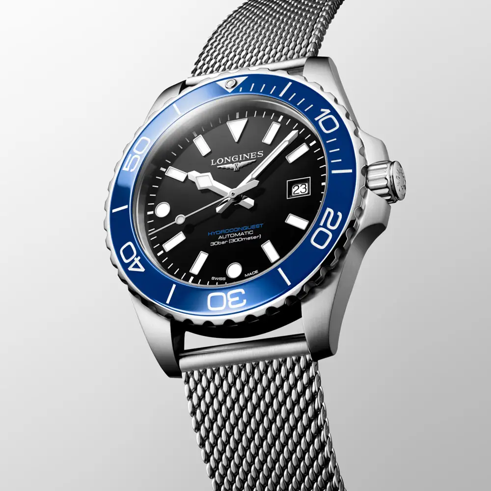 Các mẫu HydroConquest có vỏ đồng hồ chắc chắn bằng thép không gỉ, gốm hoặc titan, khả năng chống thấm nước đến 300 mét và vòng bezel xoay một chiều để đo thời gian dưới nước một cách an toàn. Mặt số với các tông màu xanh, đen, xám hoặc xanh lá cây được bổ sung bởi các kim và chỉ số phát quang, đảm bảo khả năng đọc hoàn hảo ngay cả ở độ sâu của đại dương.