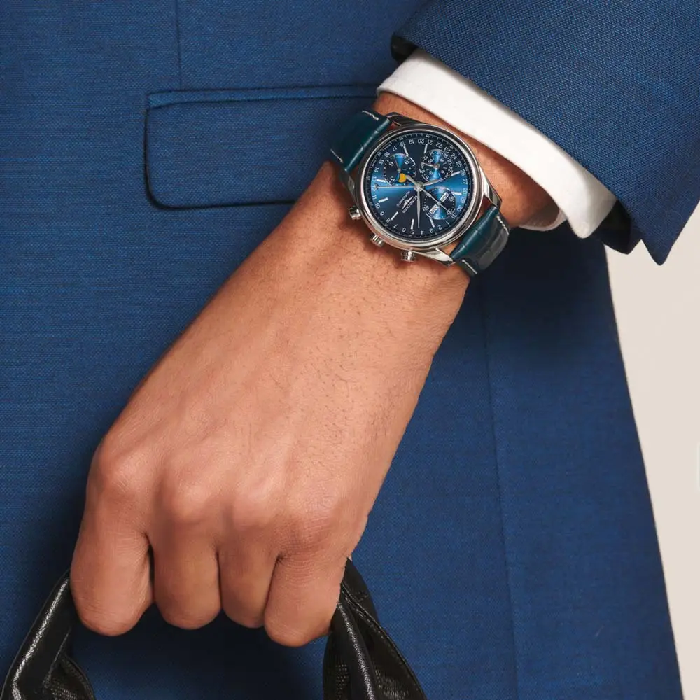 Trên mặt số xanh sunray, các cọc số nổi, kim bạc và mặt số phụ chronograph nổi bật. Tại vị trí 6 giờ là cửa sổ kết hợp lịch tuần trăng và ngày, trong khi thứ và tháng hiển thị ở phía trên.