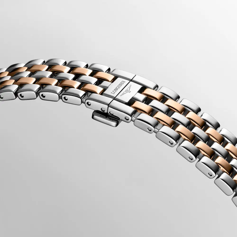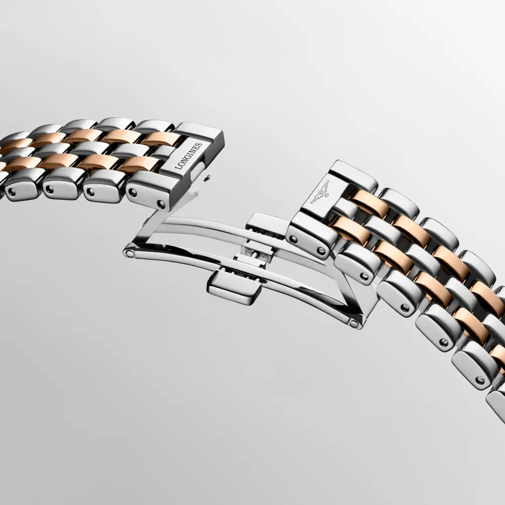 Đồng hồ được trang bị bộ máy quartz calibre L178, đảm bảo độ chính xác và độ tin cậy cao. Dây đeo thép kết hợp vàng hồng với khóa gập an toàn hoàn thiện thiết kế sang trọng, trong khi khả năng chống nước 3 bar (30 m) phù hợp cho sử dụng hằng ngày.