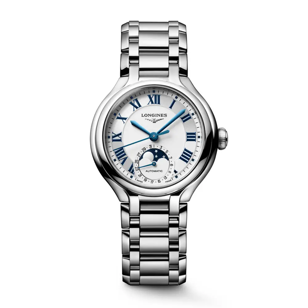 Longines PrimaLuna Moonphase là biểu tượng của sự thanh lịch nữ tính kết hợp với nét lãng mạn. Vỏ thép tròn có đường kính 34 mm chứa mặt số bạc với các chữ số La Mã sang trọng và hiển thị pha trăng tại vị trí 6 giờ. Kính sapphire có lớp phủ chống phản chiếu bảo vệ mặt số và đảm bảo độ rõ nét tuyệt vời ngay cả dưới ánh sáng mạnh.