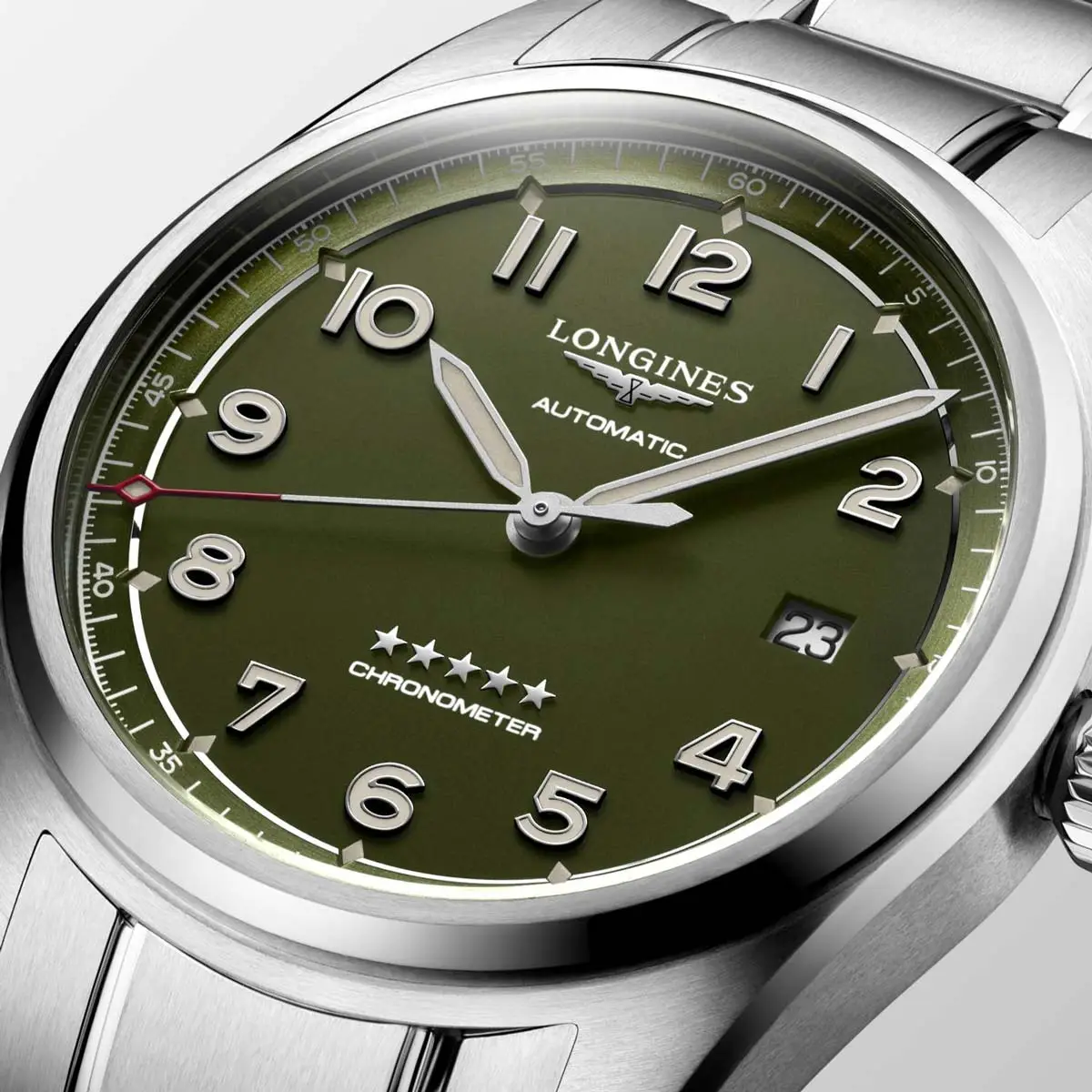 Longines Spirit L3.810.4.03.6 thuộc bộ sưu tập Spirit biểu tượng, là sự kết hợp giữa truyền thống tiên phong của Longines với độ chính xác và sự thanh lịch hiện đại. Vỏ tròn bằng thép không gỉ đường kính 40 mm mang lại vẻ ngoài mạnh mẽ và thời trang, trong khi mặt số màu xanh lá cây với kim và cọc số dạ quang đảm bảo dễ đọc cả ban ngày lẫn ban đêm.