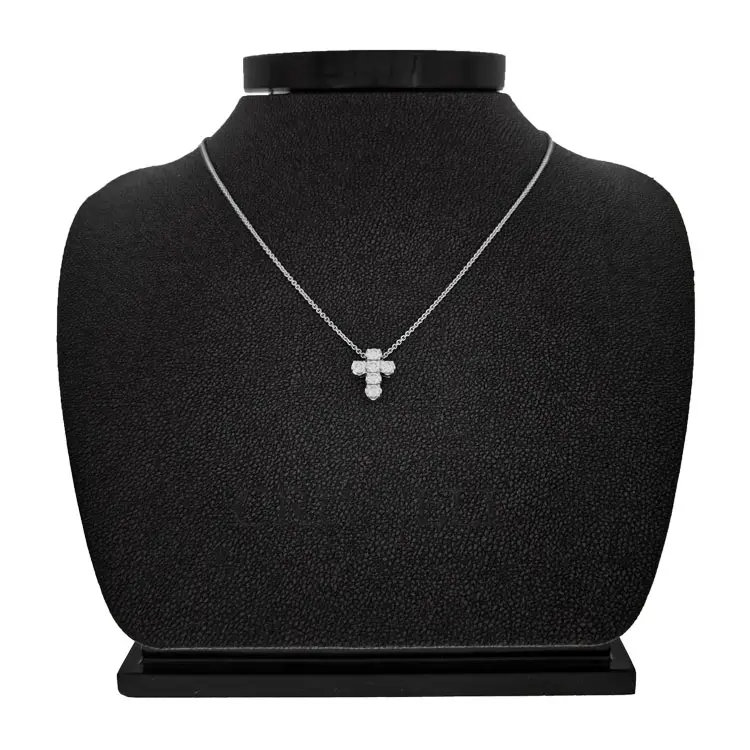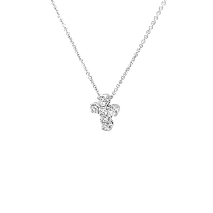 Mặt dây chuyền thánh giá vàng đính kim cương kết hợp ý nghĩa tâm linh với nét thanh lịch vượt thời gian. Chế tác từ vàng trắng 18kt (750/1000), hoàn thiện đánh bóng, cùng họa tiết thánh giá (tôn giáo) dịu dàng nhưng nổi bật—phù hợp đeo hằng ngày lẫn dịp đặc biệt.