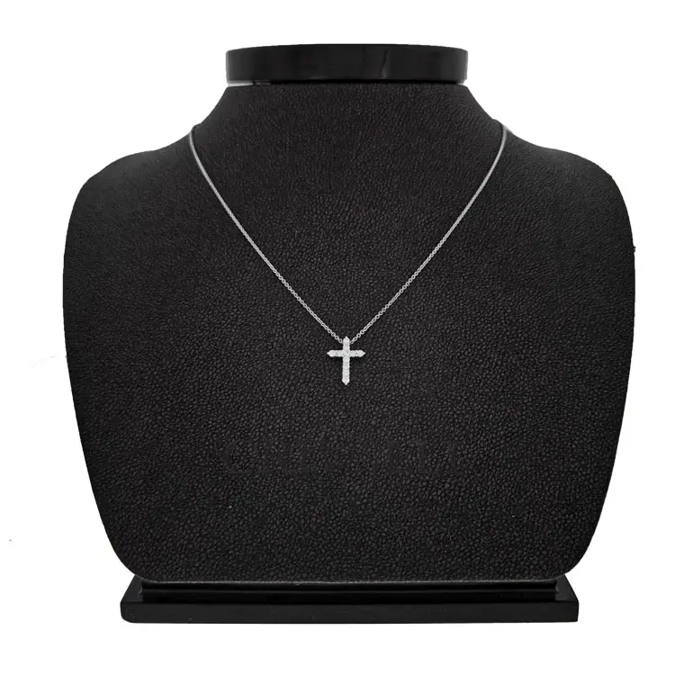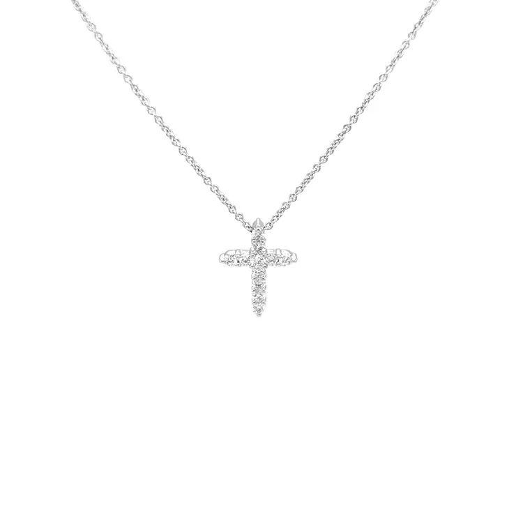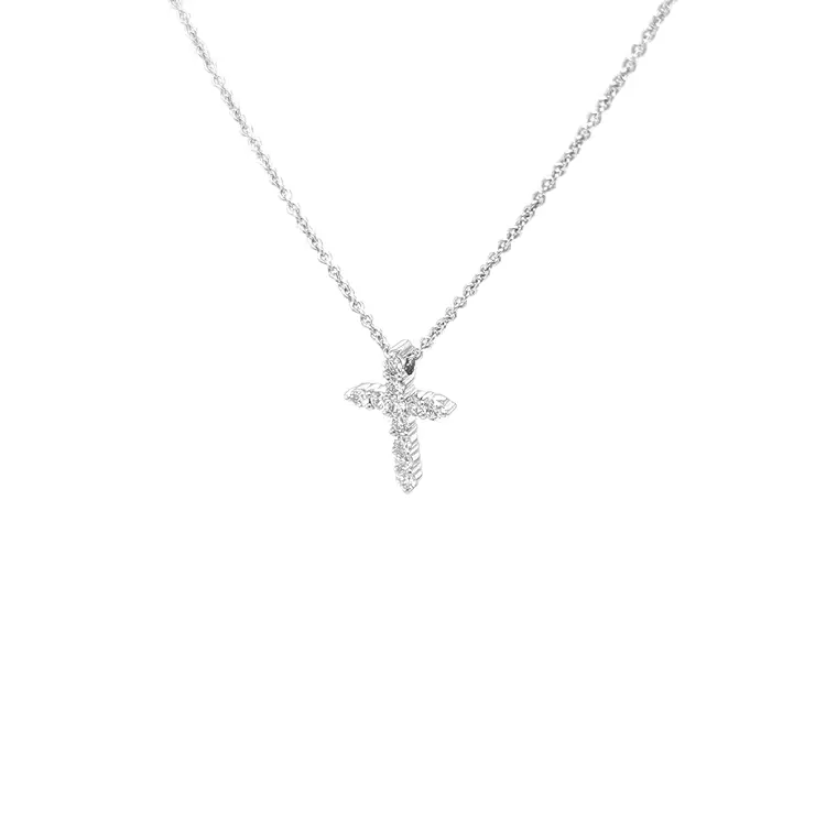 Mặt dây chuyền thánh giá vàng đính kim cương kết hợp ý nghĩa tâm linh với vẻ thanh lịch vượt thời gian. Chế tác từ vàng trắng 18kt (750/1000), hoàn thiện đánh bóng, cùng họa tiết thánh giá (tôn giáo) dịu dàng mà nổi bật—phù hợp đeo hằng ngày lẫn dịp đặc biệt.