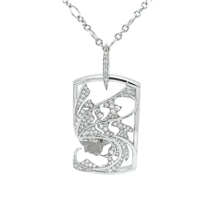 Trung tâm của mặt dây chuyền là 112 viên kim cương tự nhiên, tổng trọng lượng 0,87 ct, cắt dạng tròn (Round), đạt chuẩn màu G và độ tinh khiết VS. Những viên đá nhỏ được sắp xếp tỉ mỉ, tái hiện đường cong mềm mại của nàng tiên cá huyền thoại – biểu tượng cho vẻ đẹp và sự tự do của người phụ nữ.