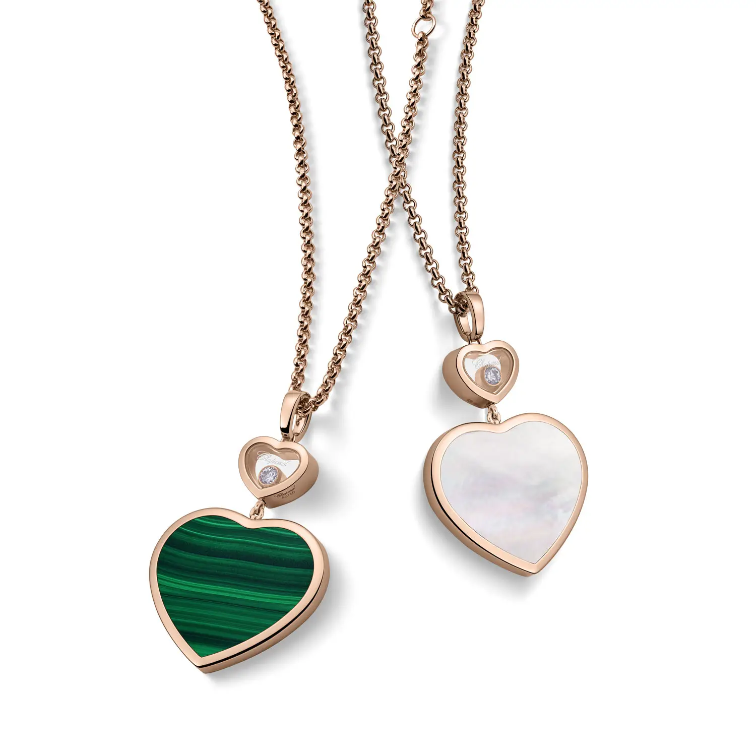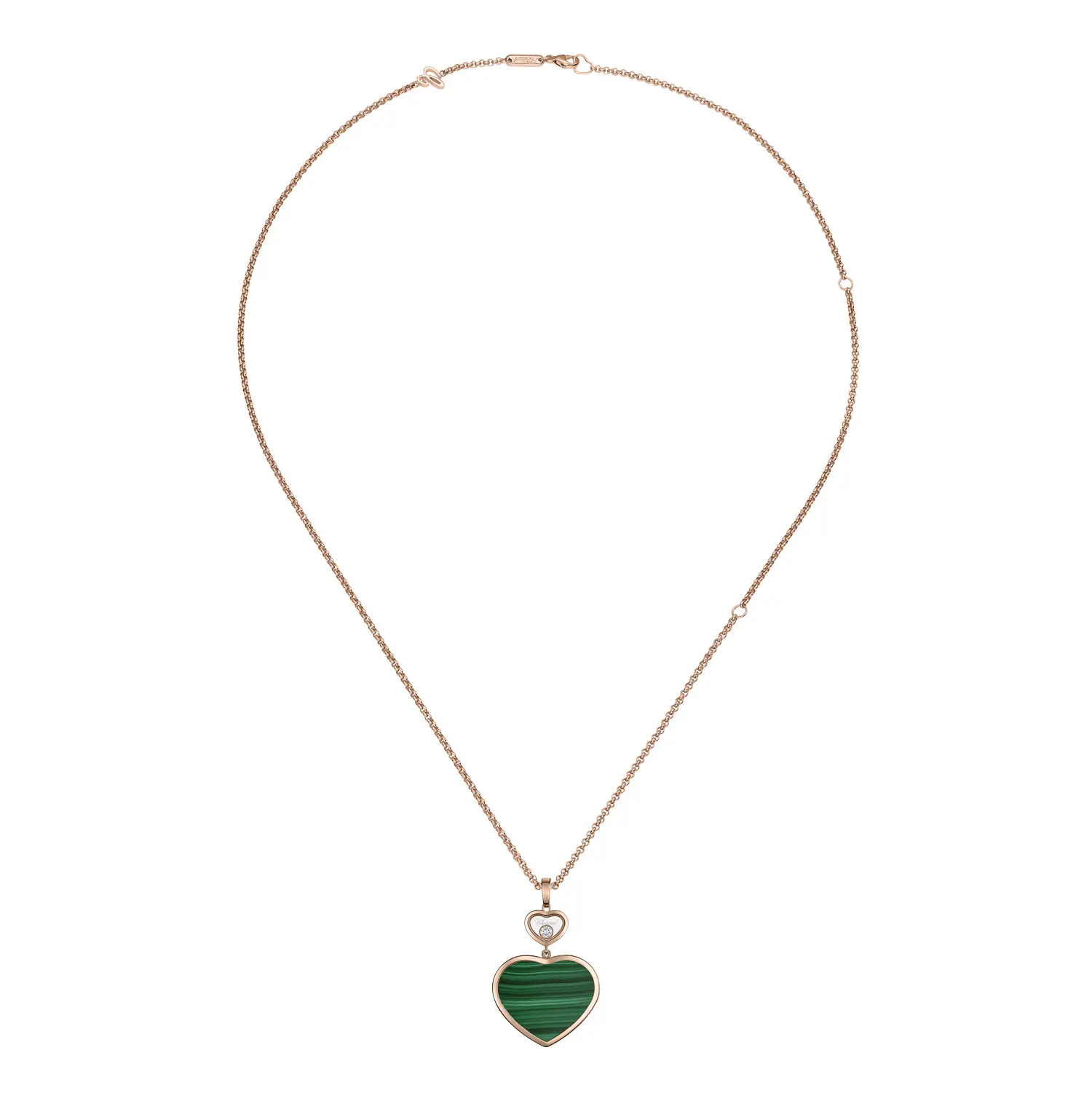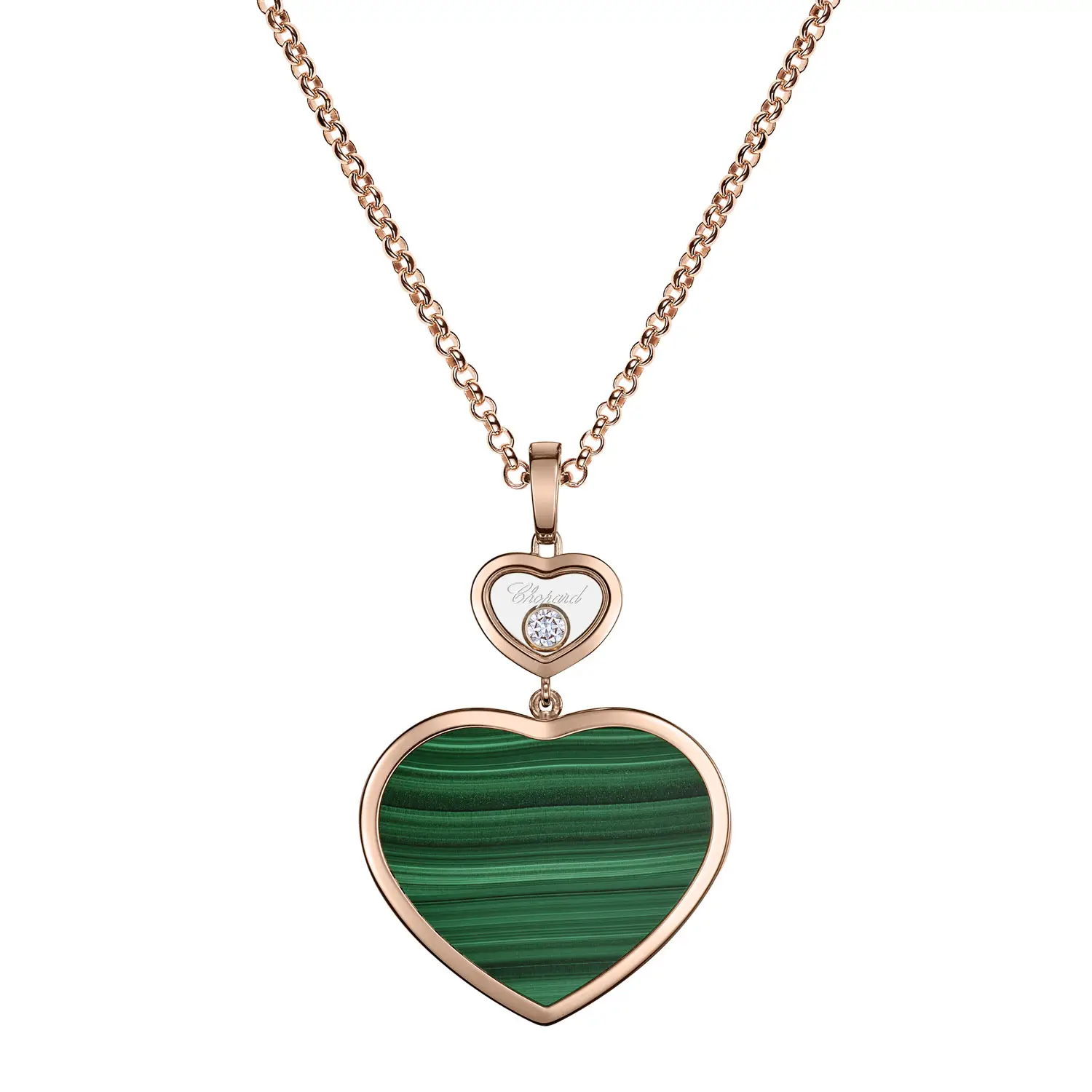 Mặt dây chuyền Chopard Happy Hearts 79A075-5151 thể hiện sự thanh lịch, tinh tế và nét sang trọng hiện đại. Được chế tác từ vàng hồng 18 cara có nguồn gốc đạo đức, chiếc mặt dây được trang trí bằng trái tim đá malachite – biểu tượng của sự hài hòa và năng lượng tích cực – cùng viên kim cương 0,10 ct.