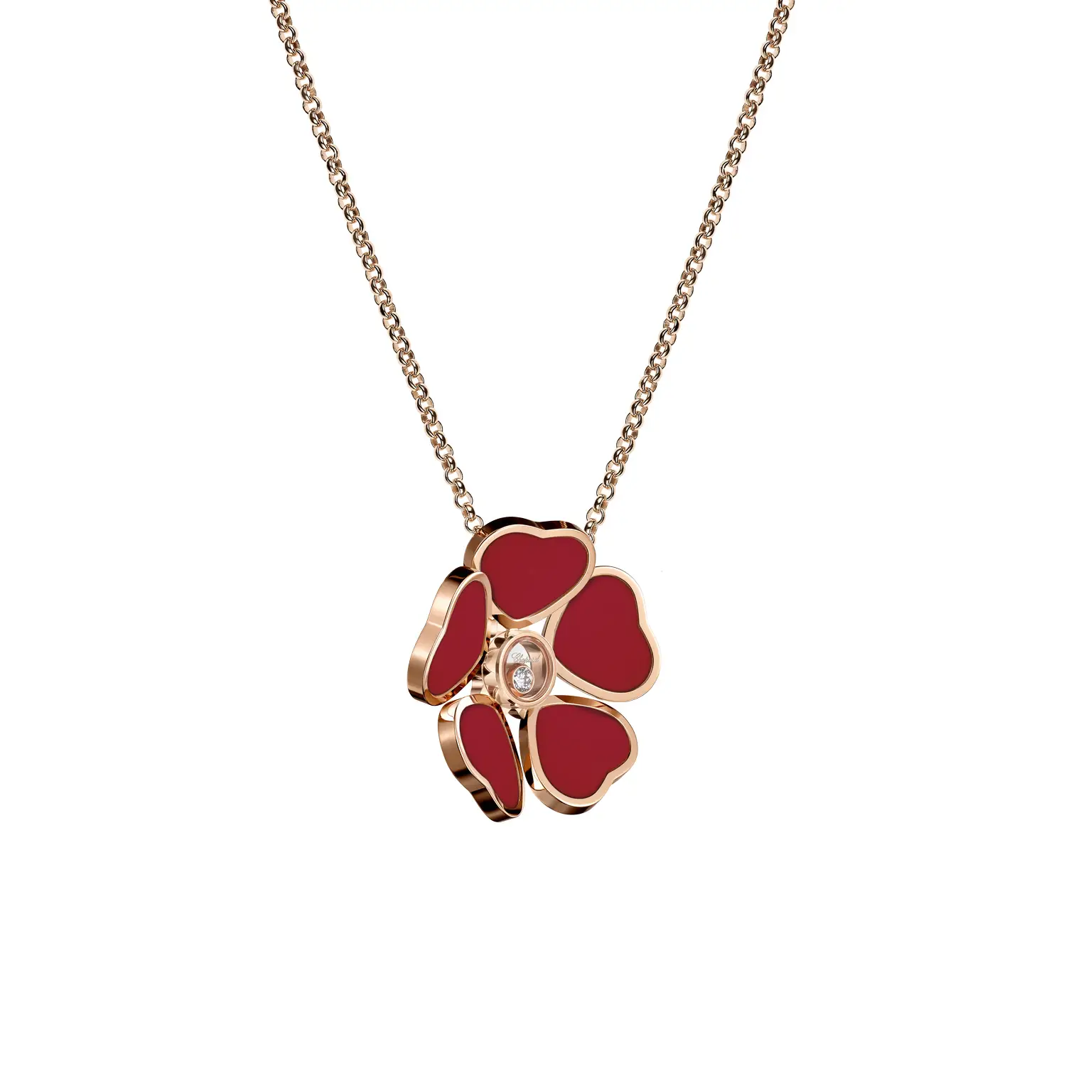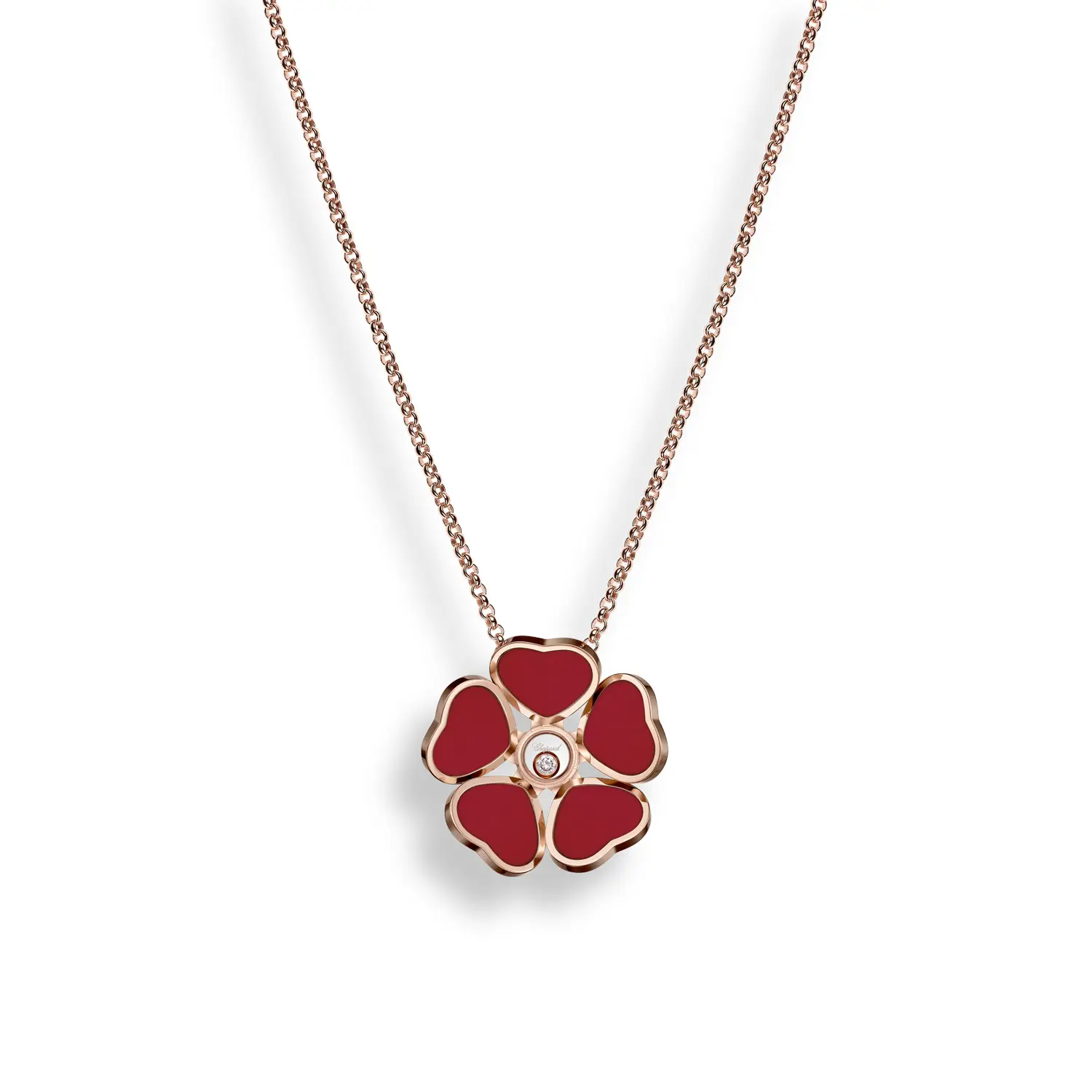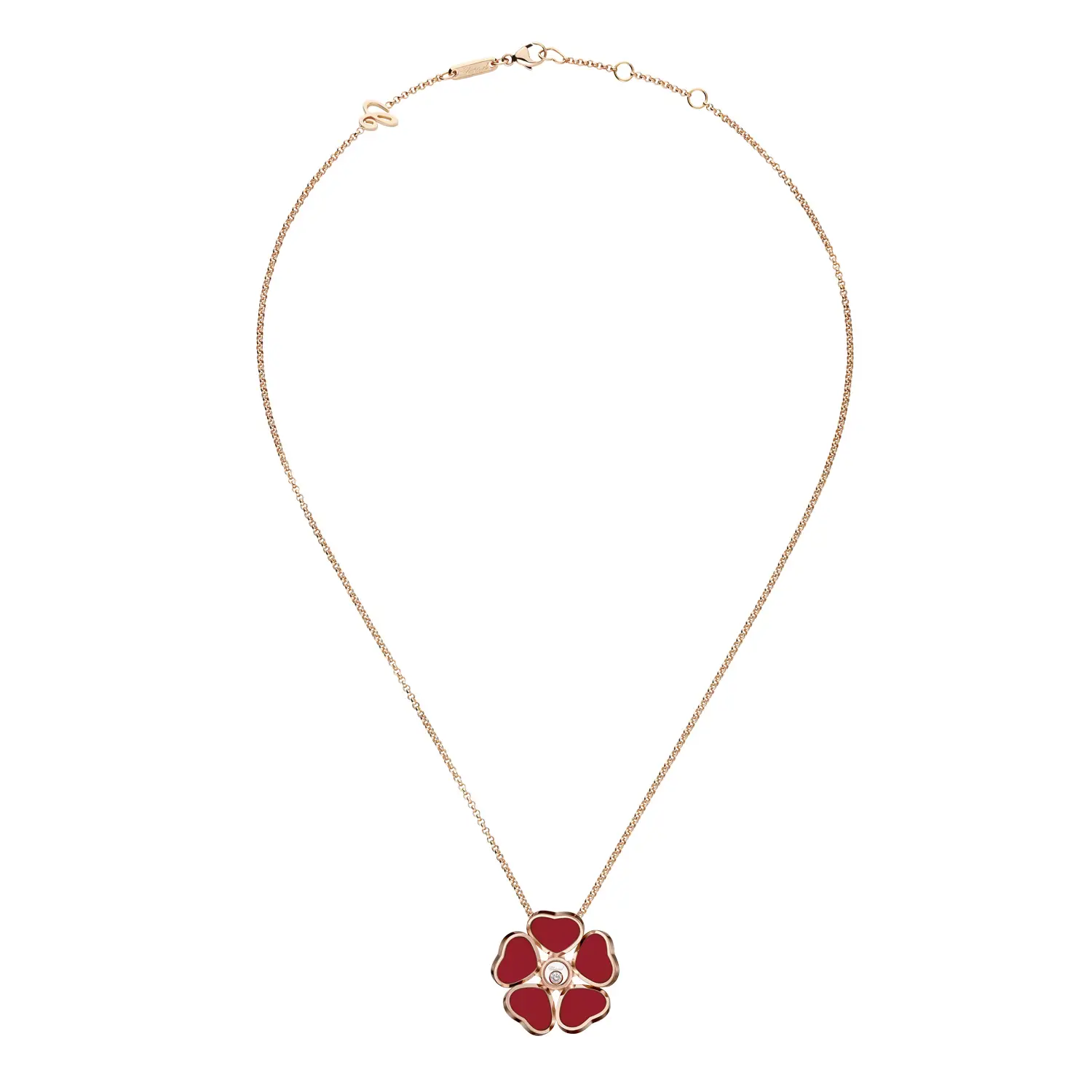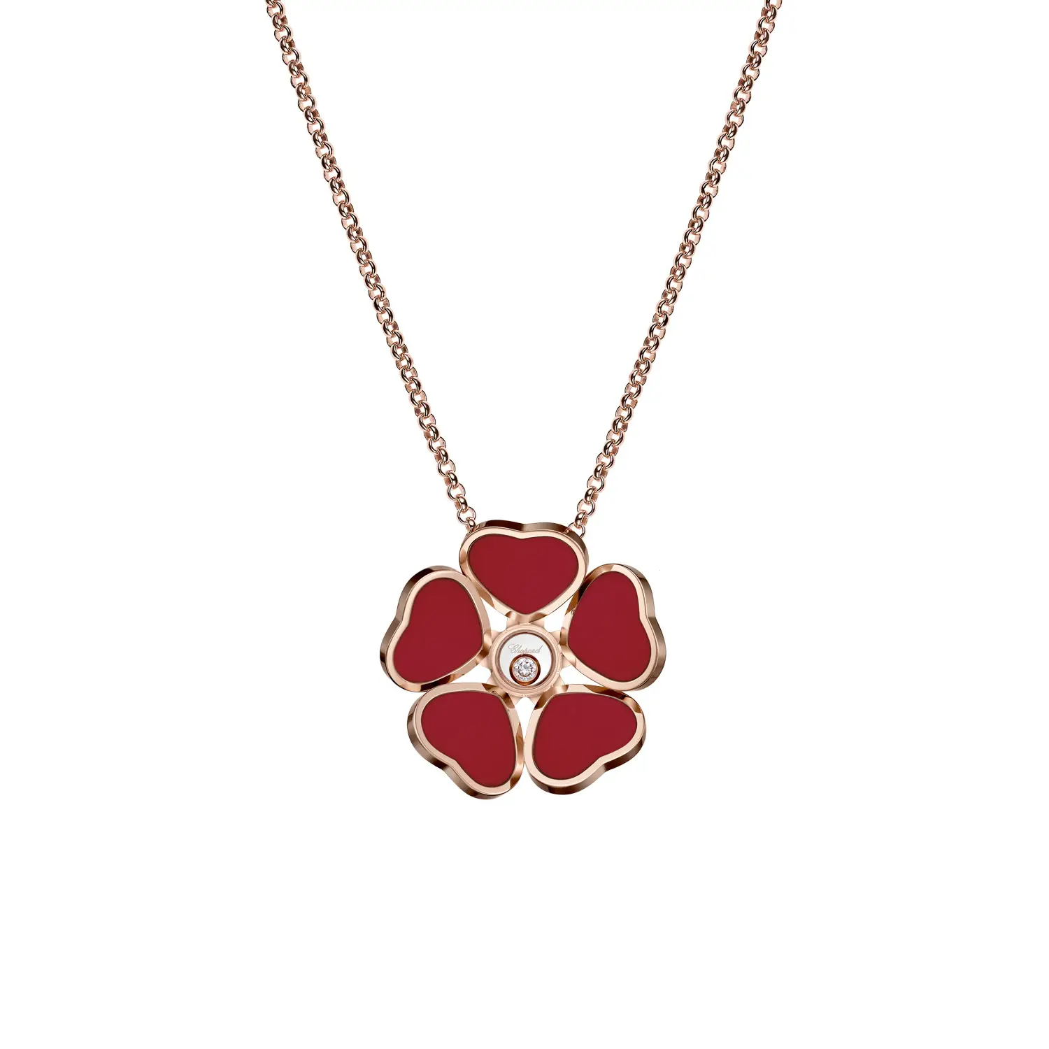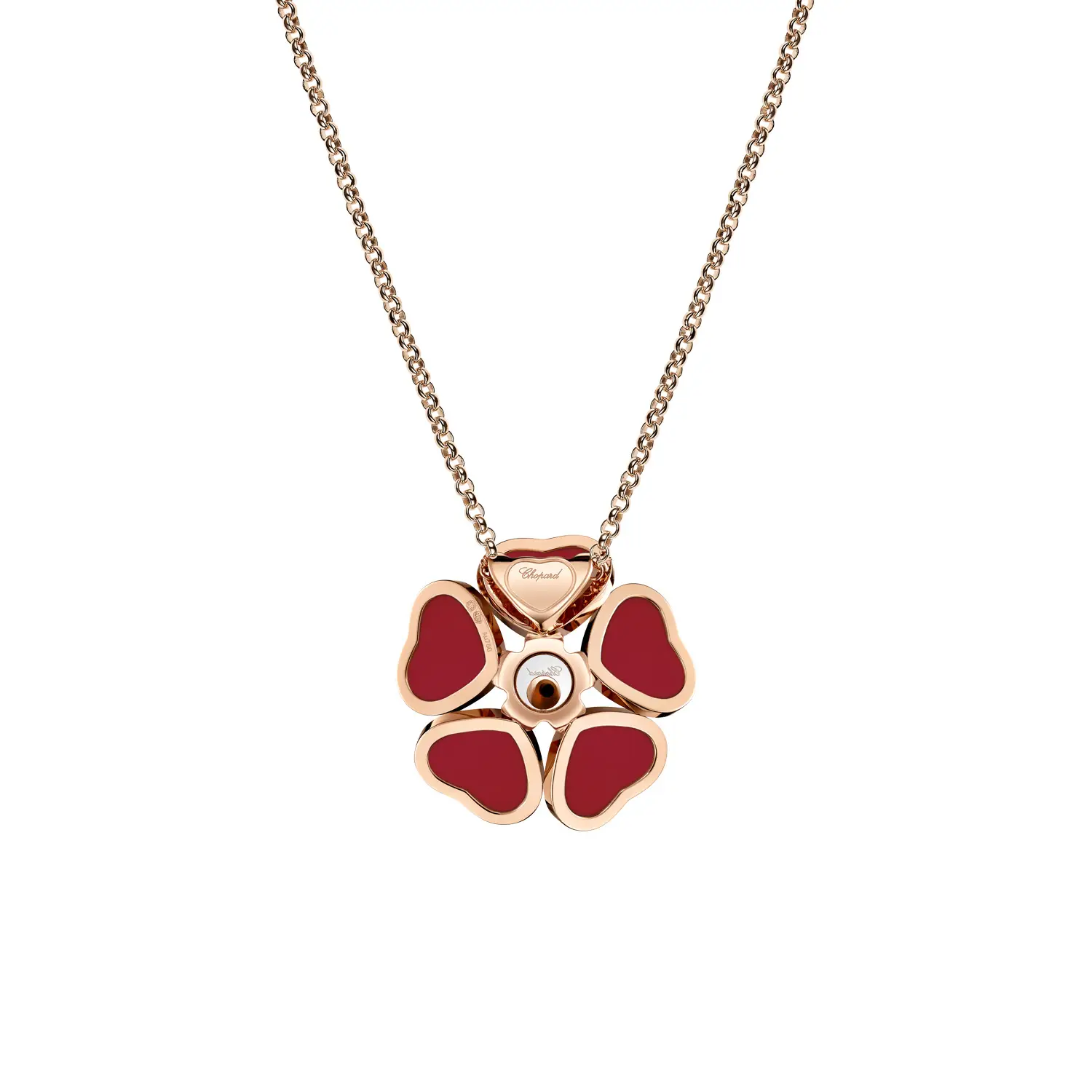 Được chế tác từ vàng hồng 18 karat (750/1000) với bề mặt đánh bóng mịn, mặt dây chuyền kết hợp hình dáng bông hoa và trái tim, tượng trưng cho nữ tính, sự dịu dàng và tình yêu – trong một thiết kế nổi bật và khó quên.