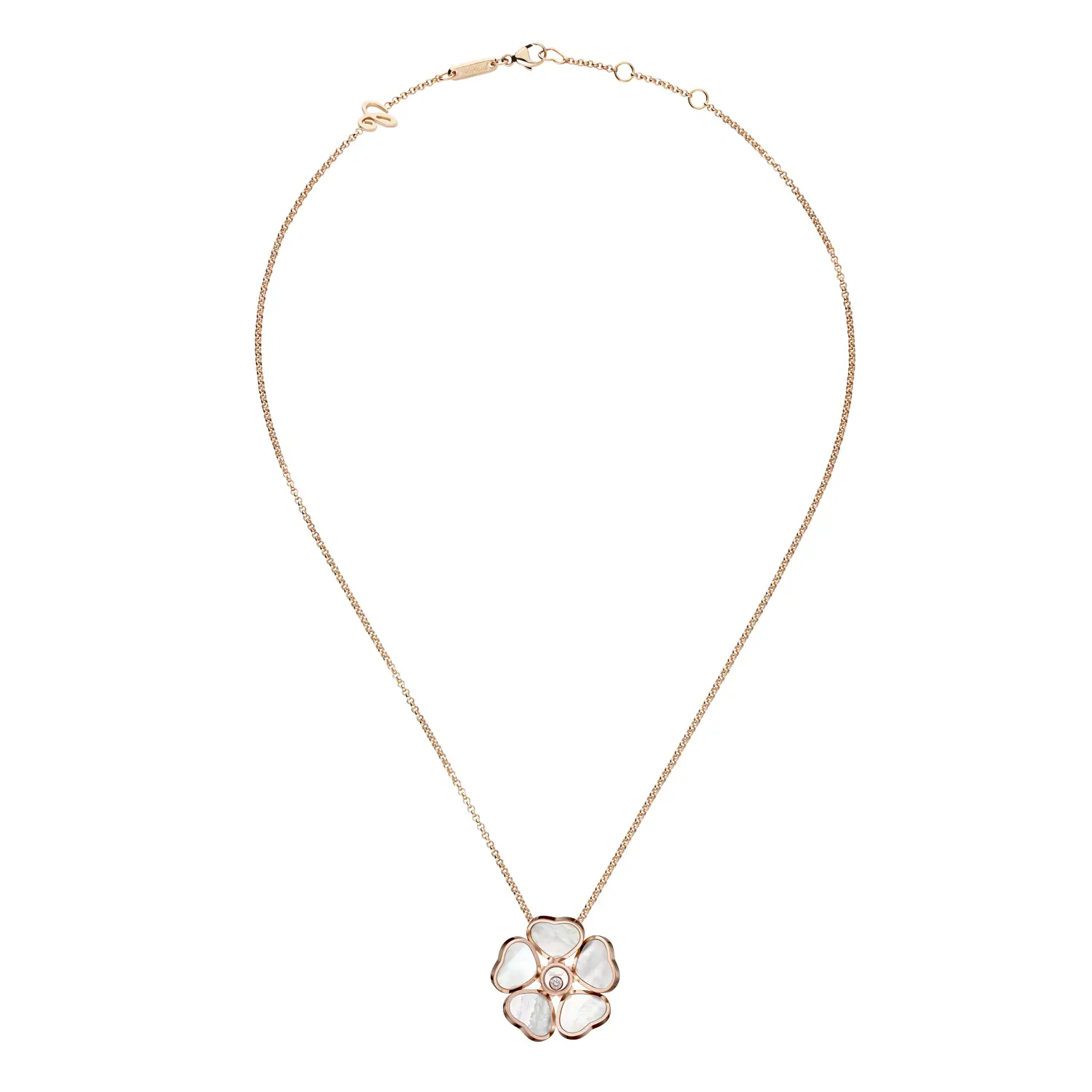 Dây chuyền dài 45 cm mang lại vẻ nhẹ nhàng nhưng cuốn hút. Mỗi chi tiết thể hiện tay nghề thủ công tinh xảo của Chopard, là sự kết hợp hoàn hảo giữa thiết kế tươi vui và phong cách thanh lịch vượt thời gian – biểu tượng của tình yêu, hạnh phúc và sự nhẹ nhàng trong cuộc sống.