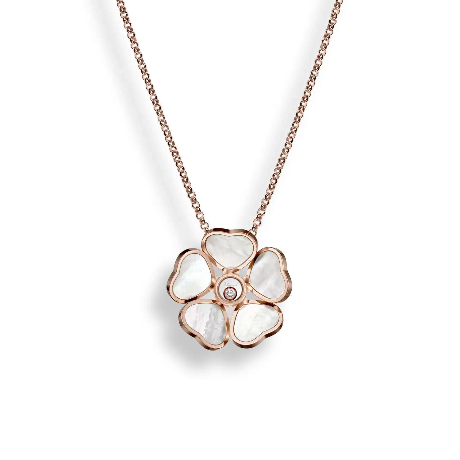 Mặt dây chuyền Chopard Happy Hearts Flowers 79A085-5301 tôn vinh niềm vui, tình yêu và nét duyên dáng nữ tính. Được chế tác từ vàng hồng 18 cara có nguồn gốc đạo đức, thiết kế lấy cảm hứng từ bông hoa gồm năm cánh hình trái tim, bao quanh viên kim cương tự do chuyển động – hiệu ứng “dancing diamond” đặc trưng, tượng trưng cho tự do và niềm lạc quan.