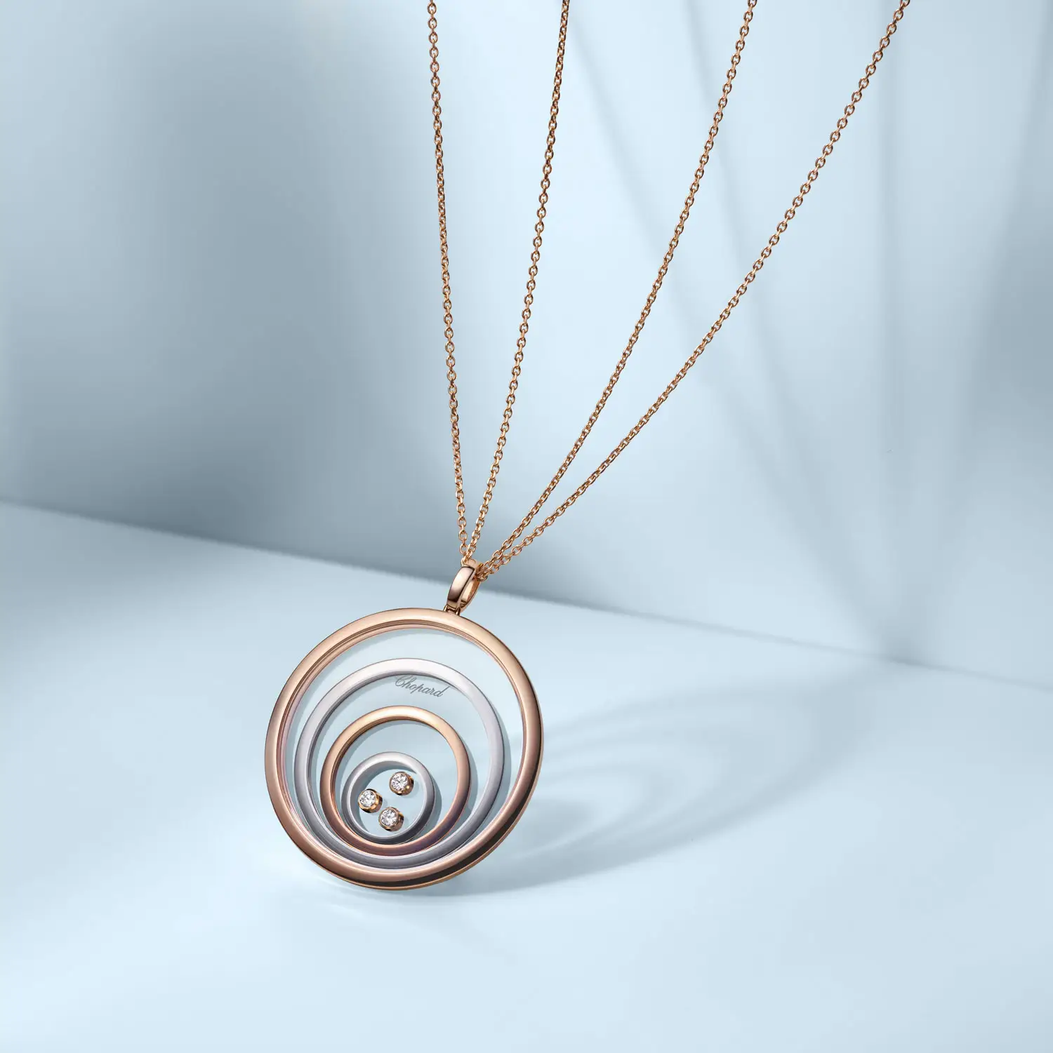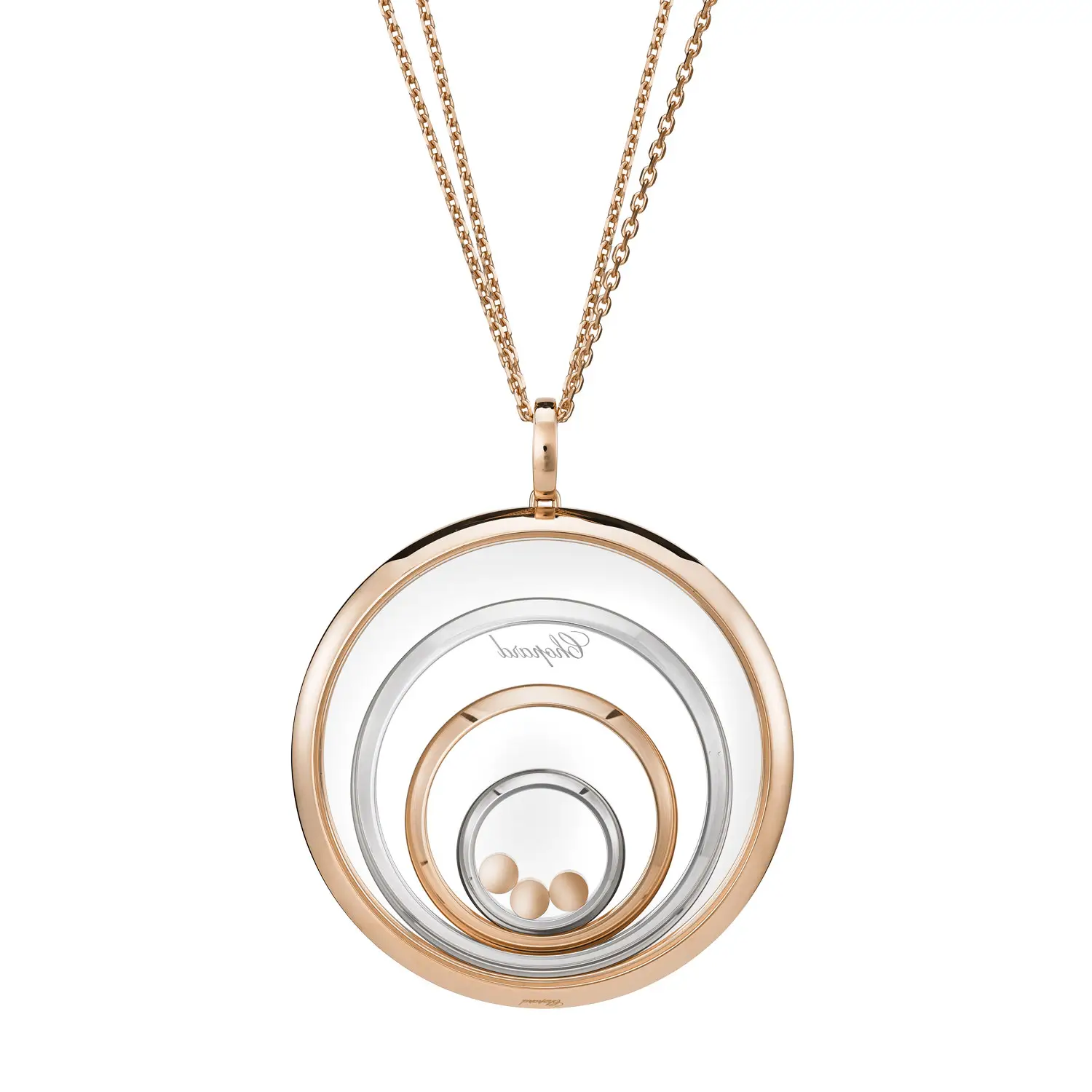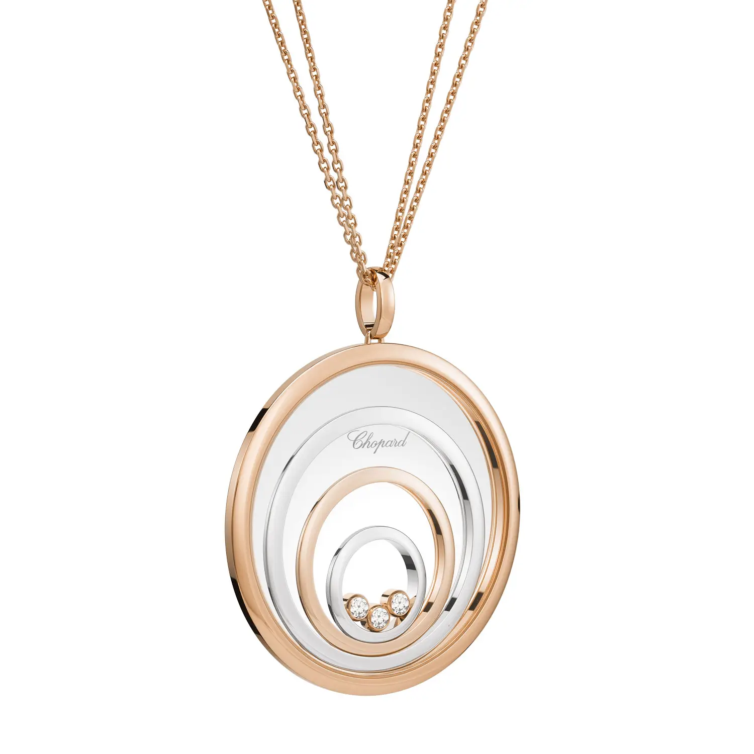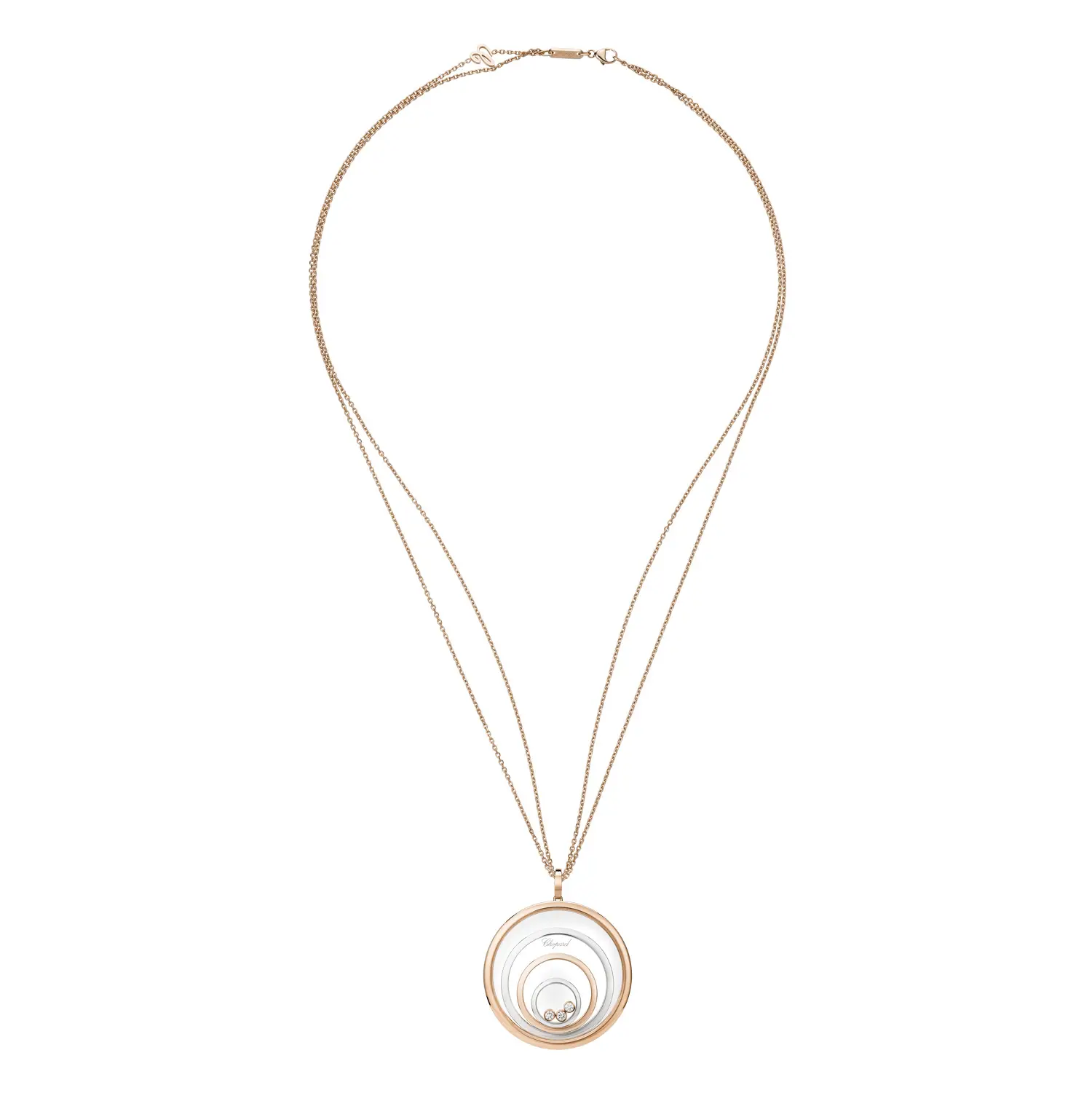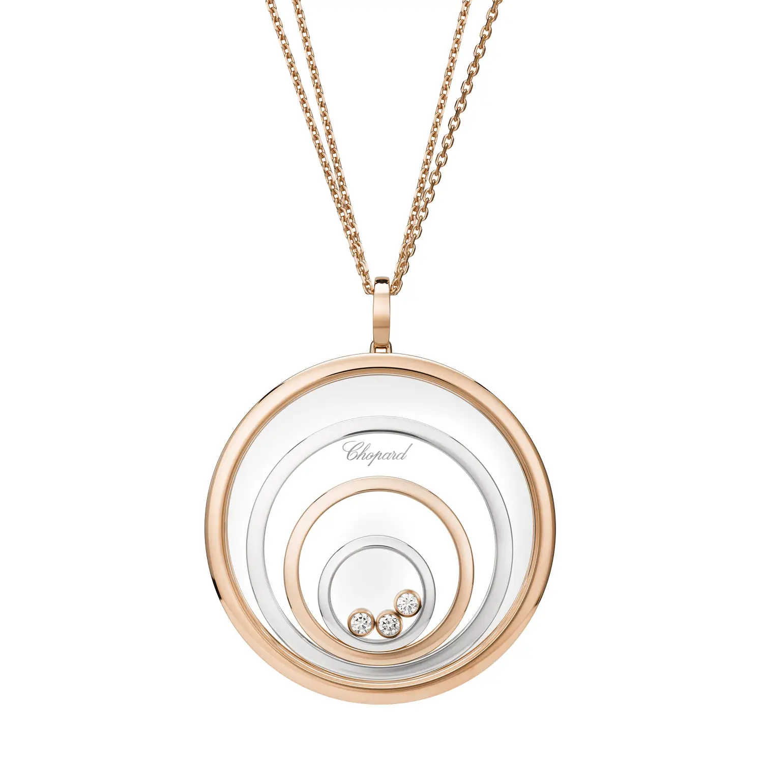 Mặt dây chuyền Chopard Happy Spirit 798233-9001 là biểu tượng của sự hài hòa, nữ tính và vẻ đẹp vượt thời gian. Được chế tác từ vàng hồng và vàng trắng 18 cara có nguồn gốc đạo đức, thiết kế gồm các vòng tròn đồng tâm tượng trưng cho sự cân bằng và tĩnh tại. Ở trung tâm, viên kim cương tự do chuyển động giữa hai lớp kính sapphire, được bao quanh bởi các viên đá tổng trọng lượng 0,28 cara – hiệu ứng “dancing diamond” đặc trưng tỏa sáng theo từng cử động.