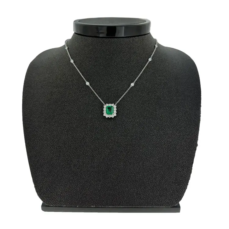 Được chế tác từ vàng trắng 18 kt (750/1000), mặt dây chuyền nặng 4,3 g mang vẻ đẹp cân đối và bền bỉ. Viên ngọc lục bảo tự nhiên 1,46 ct được cắt dáng emerald tinh tế, kết hợp với kim cương tổng cộng 0,64 + 0,16 ct đạt chuẩn G/VS, tạo nên sự hài hòa giữa ánh sáng và màu sắc.