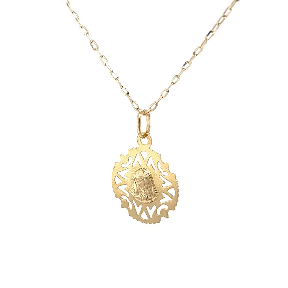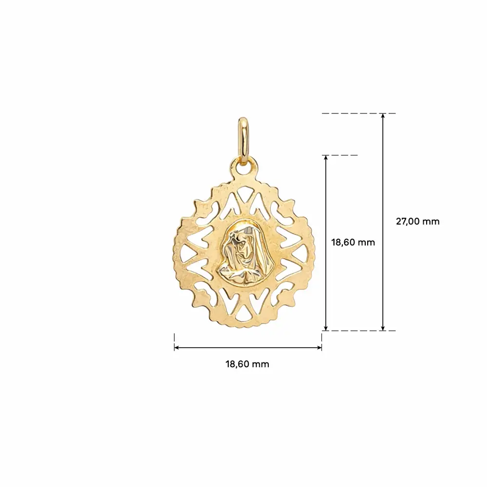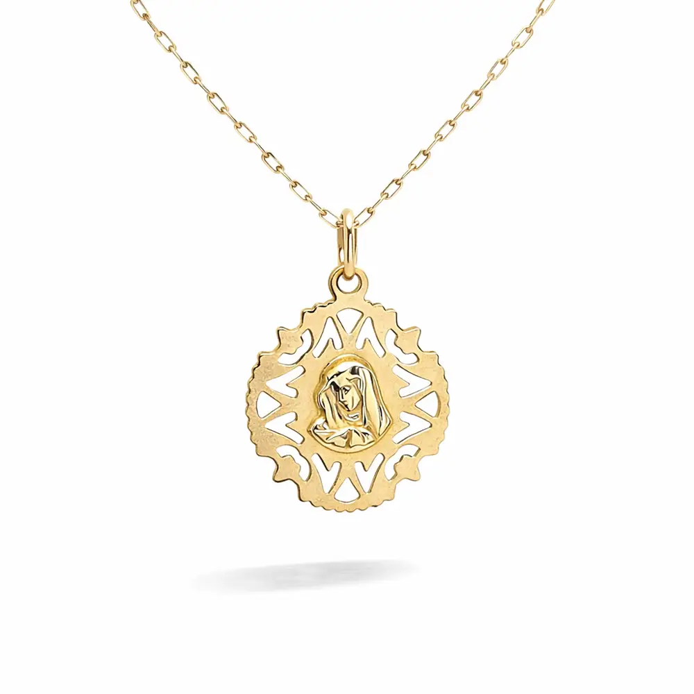 Mặt dây chuyền vàng tinh xảo với hình chạm khắc Đức Mẹ Maria, được bao quanh bởi khung hoa văn trang trí, mang vẻ đẹp truyền thống và vượt thời gian. Kỹ thuật chế tác chính xác cùng những đường nét tinh tế làm nổi bật chi tiết của họa tiết và ánh vàng tự nhiên, tạo nên tổng thể thanh lịch và hài hòa.