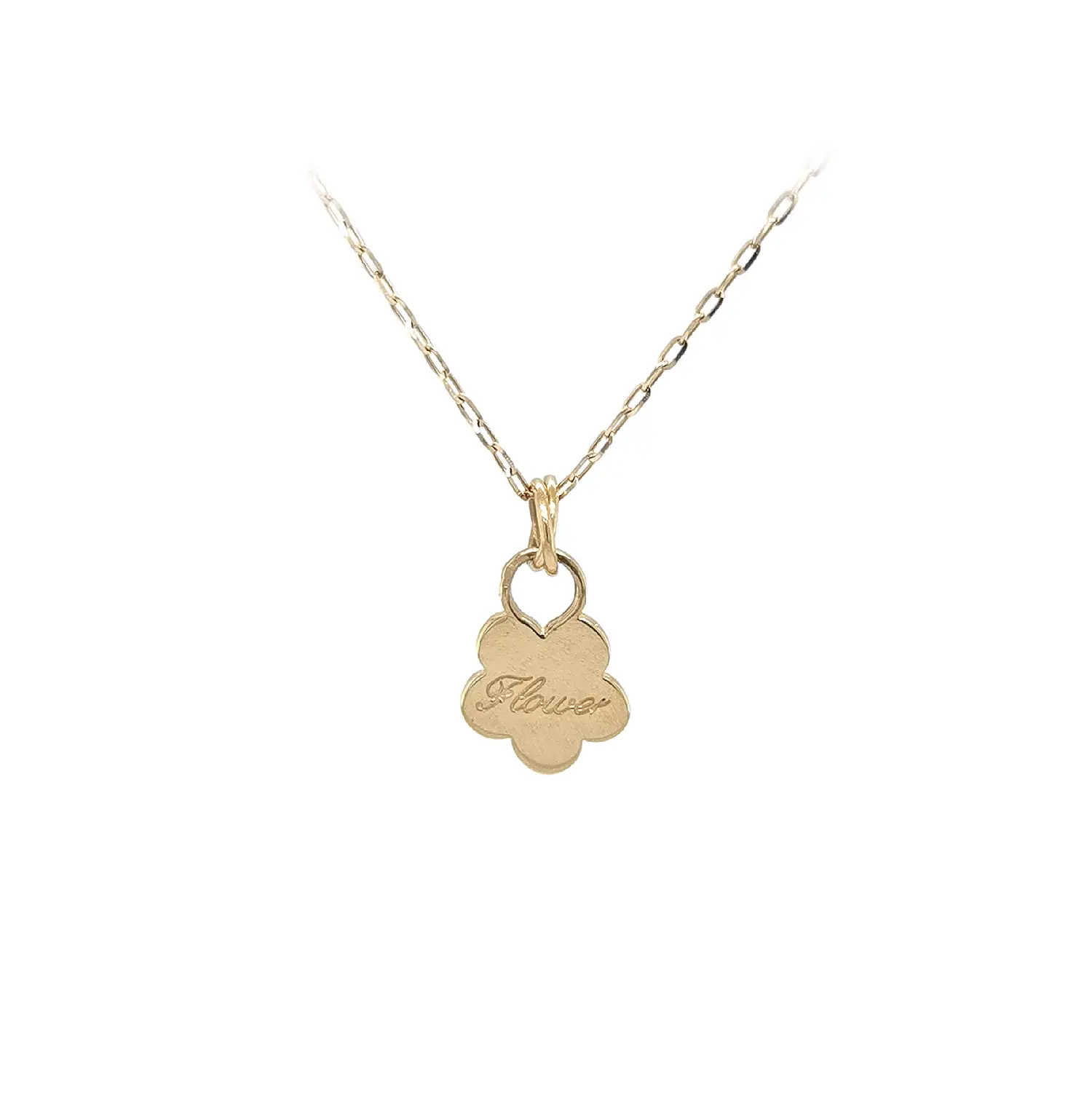 Chiếc mặt dây chuyền vàng hình hoa với khắc chữ “Flower” tinh tế mang vẻ đẹp dịu dàng và thanh lịch. Thiết kế đơn giản kết hợp bề mặt mịn và chi tiết khắc nhẹ nhàng tạo nên món trang sức vượt thời gian, tượng trưng cho vẻ đẹp, niềm vui và sự nữ tính tự nhiên.