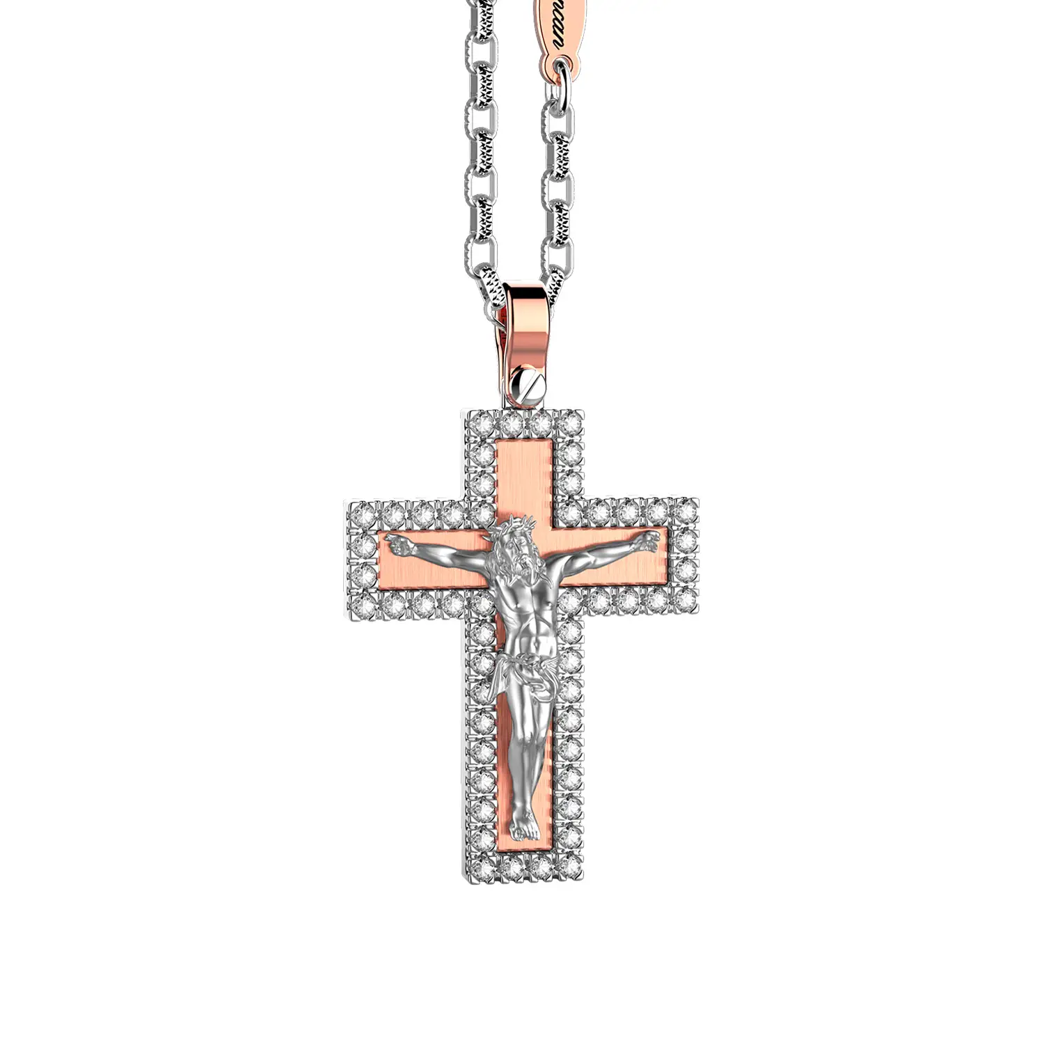 Zancan Couture EC901RB là mặt dây chuyền nổi bật, kết hợp thiết kế hiện đại với biểu tượng đức tin cá nhân. Chế tác từ vàng 18kt (750/1000) hai tông (bicolor) trắng & hồng cùng tương phản bóng / mờ tinh tế, mang họa tiết thánh giá (tôn giáo) và đi kèm dây 60 cm—phù hợp đeo mỗi ngày lẫn dịp đặc biệt.