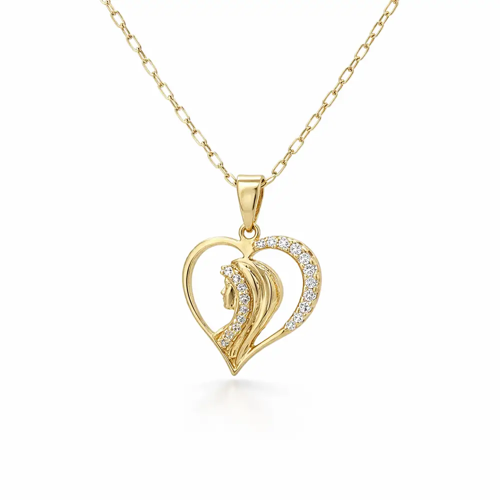 Chiếc mặt dây chuyền vàng Madonna trong hình trái tim đính zirconia là biểu tượng tinh tế của sự che chở, đức tin và tình yêu. Hình ảnh Đức Mẹ được chế tác tỉ mỉ, đặt trong khung trái tim thanh lịch, một bên được đính các viên zirconia lấp lánh. Sự kết hợp giữa vàng sáng bóng và đá trang trí mang đến vẻ đẹp trang nhã nhưng đầy ý nghĩa.